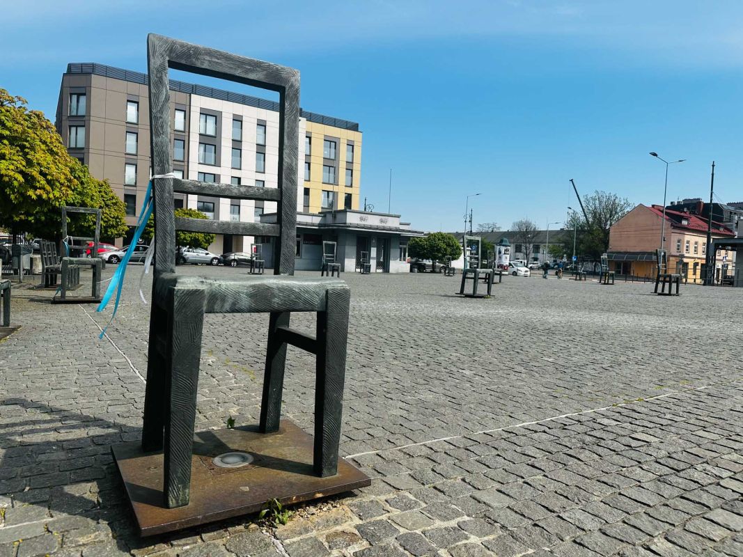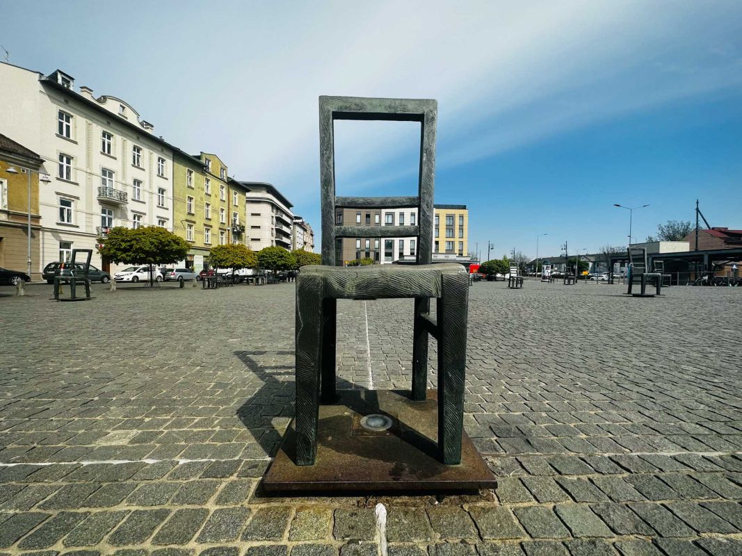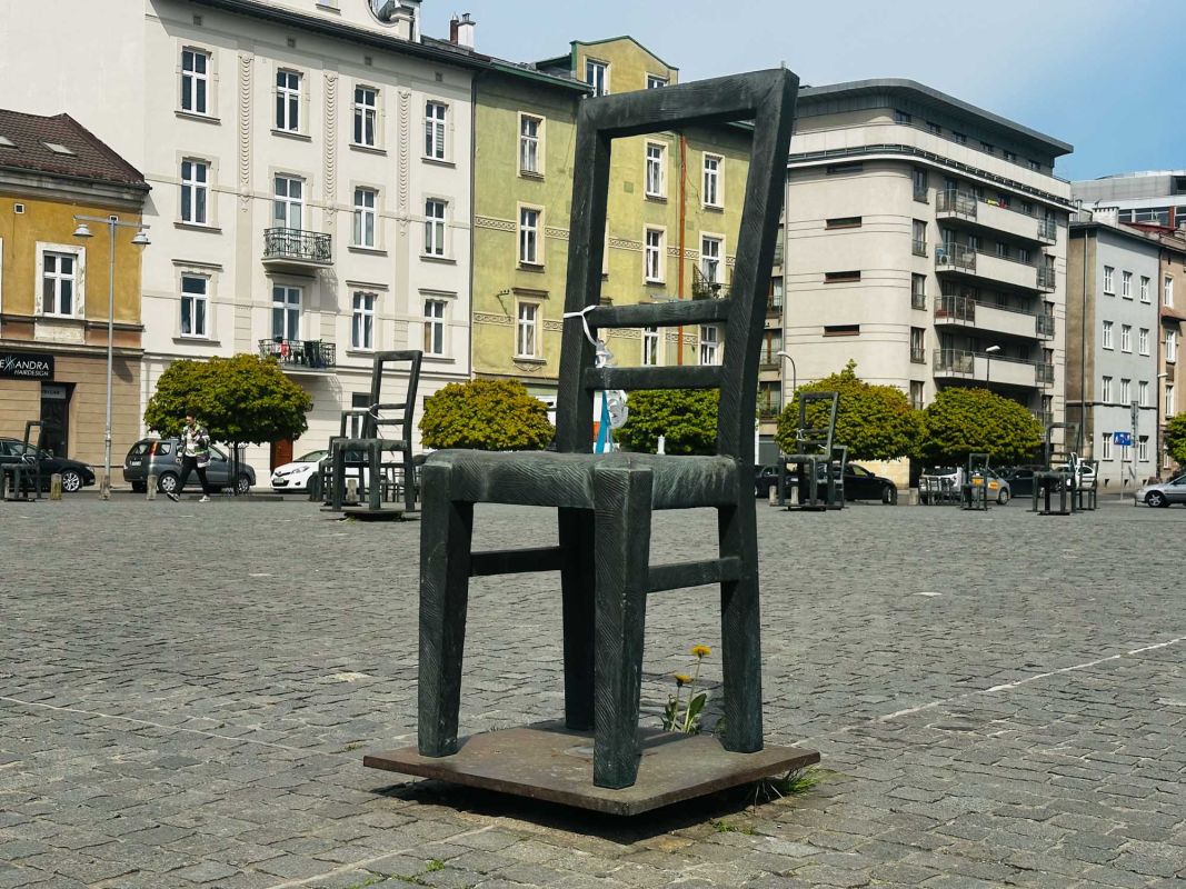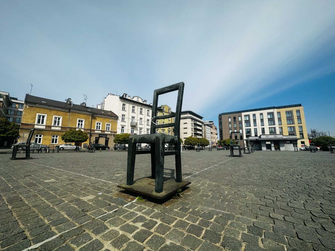 Мемориал Жертвам Краковского Гетто расположен в Кракове, на Площади Героев Гетто. В 1941-1943 годах в районе Подгуже, рядом с Площадью Согласия (с 2005 года - Площадь Героев Гетто) располагалось Краковское гетто, обнесённое трёхметровой бетонной стеной, выполненной в виде еврейских надгробий, выйти за пределы которой ни один живой "житель" еврейского квартала не мог. Перед началом Второй мировой войны в Кракове проживало более 64000 евреев (около 25% населения города), после отправки которых в начале войны в концентрационные лагеря, в городе оставалось не более 16000. Все евреи были согнаны в гетто, откуда их отправляли в концентрационные лагеря или в лагеря принудительного труда. Во время облав и транспортировки многие жители так называемого "Еврейского жилого района", прятавшиеся от фашистов или совершавшие попытку побега, расстреливались на месте. Среди сотен казнённых были художник Абрахам Ньюман и поэт Мордехай Гебиртиг. Фашисты не щадили стариков, детей и больных - все непригодные к работе и транспортировке были расстреляны. К 1942 году численность Краковских евреев снизилась в разы, гетто было разделено на две зоны, обнесенные колючей проволокой, - зона "А" предназначалась для тех, кто ещё был способен работать, зона "B" - для детей, престарелых и больных. В 1943 году всего за два дня (13 и 14 марта) гитлеровцы ликвидировали Краковское гетто - около 6000 евреев был отправлены в концентрационный лагерь в Плашове, а маленькие дети и их матери, больные и старики - расстреляны на плошали Согласия. Команды СС обшаривали здания на территории гетто, убивая всех, кто пытался спрятаться. В память об этих трагических событиях на месте Краковского гетто 8 декабря 2005 года был открыт Мемориал Жертвам Краковского Гетто. Он представляет собой ряды чугунных стульев, расположенных по периметру площади. Всего на площади установлено 70 стульев - 33 стула высотой 1,4 метра и 37 стульев высотой 1,2 метра. Эти стулья символизируют обезлюдевшие дома и улицы Краковского гетто, после ликвидации которого о жизни в еврейском квартале напоминала лишь валяющаяся на улицах мебель, выброшенная нацистами из квартир бывших жильцов, казнённых или угнанных в концлагеря. Здесь же, на площади, в доме №18 в те годы располагалась аптека "Под орлом", которой владел Тадеуш Панкевич - единственный поляк, живший на территории гетто. Панкевич был участником польского подполья и, рискуя собственной жизнью, помогал жителям гетто медикаментами. Сейчас здание бывшей аптеки занимает Музей Памяти.