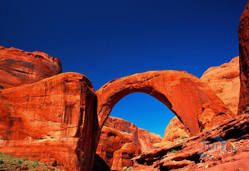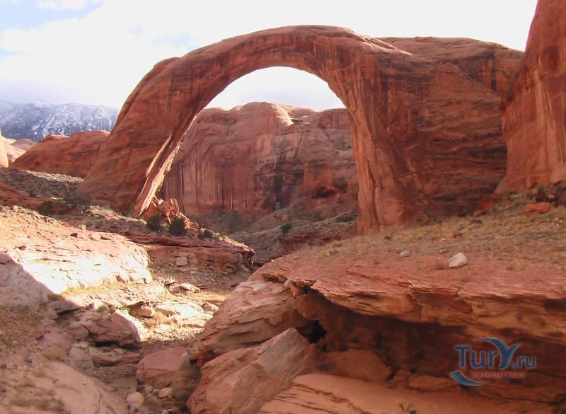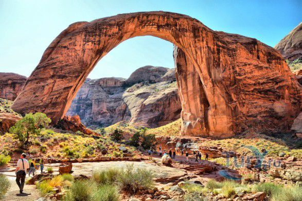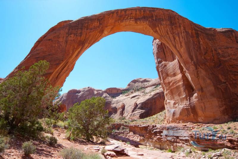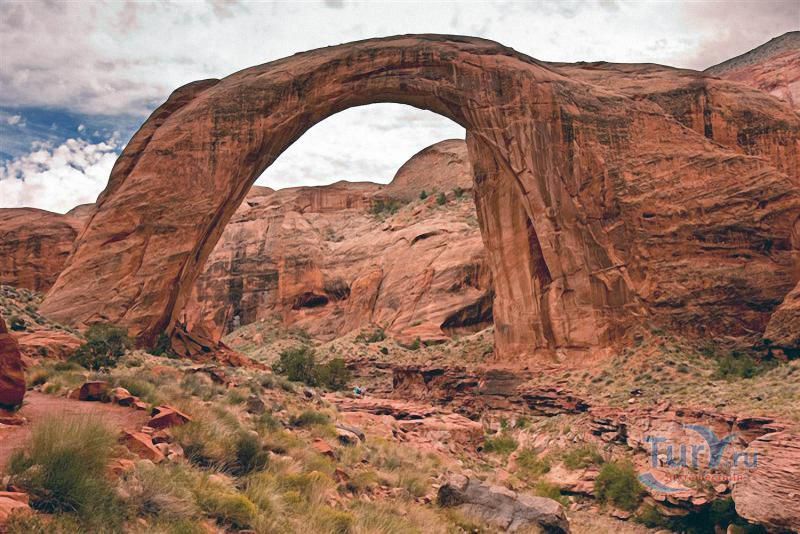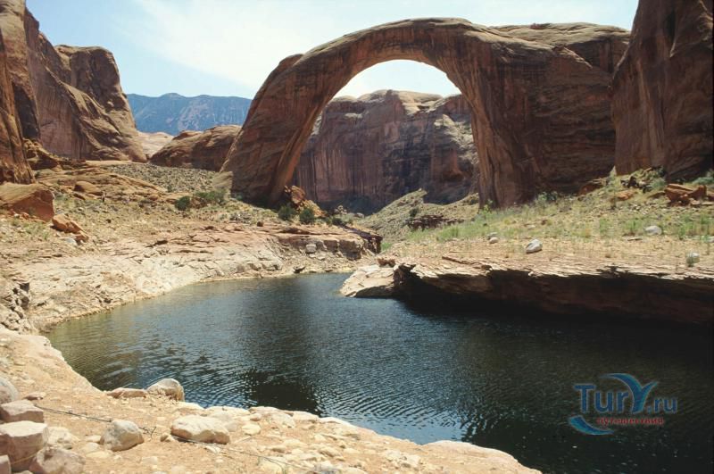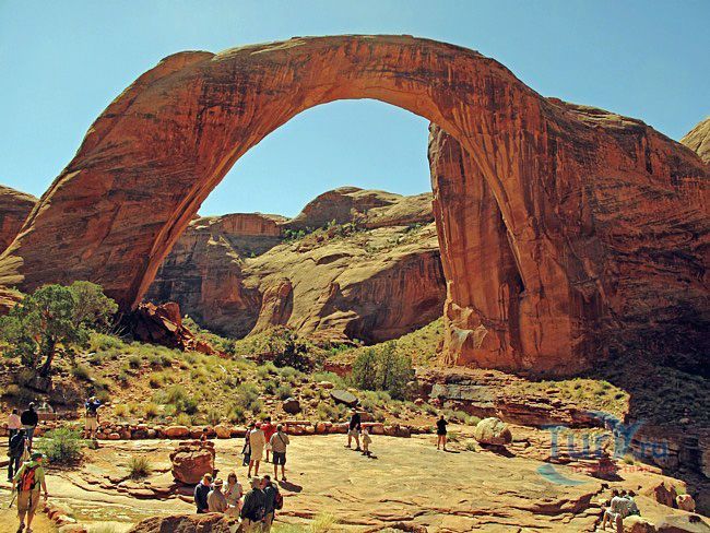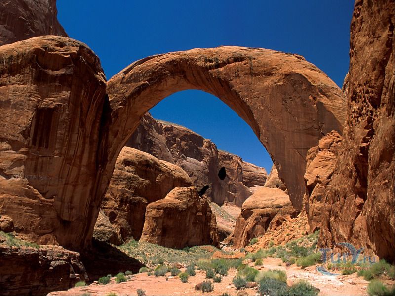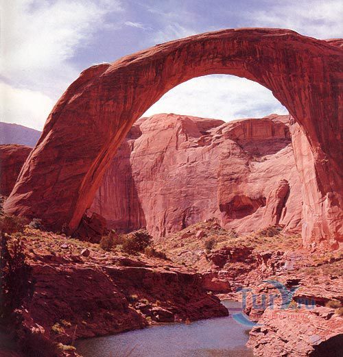 Мы привыкли к тому, что радуга – кратковременное природное явление. А североамеркианские индейцы издревле верили в существование вечной радуги. Они сумели доказать скептически настроенным европейцам, что на Земле есть место для чудес. Заинтригованные рассказами о «каменной радуге», трое европейских авантюристов в 1909 году отправились на её поиски. Им пришлось преодолеть пустыни и извилистые каньоны, а завершилось их путешествие у горы Навахо. Здесь они увидели то, о чем так много и вдохновенно говорили проводники из племен пайюты и навахо. Итак, вечной радугой оказалась каменная арка, повторяющая форму и расцветку радуги небесной. Полюбоваться этим природным чудом можно и сегодня, посетив штат Юта. В ясную погоду обычно розоватый камень выглядит темно-лиловым, закатное солнце окрашивает его в темно-красный. Природный мост длиною в 94 метра состоит из песчаника. Он соединяет склоны каньона шириной в 85 метров. Толщина камня - 13, а ширина – 10 метров, так что при желании можно проложить по нему двухполосное шоссе.