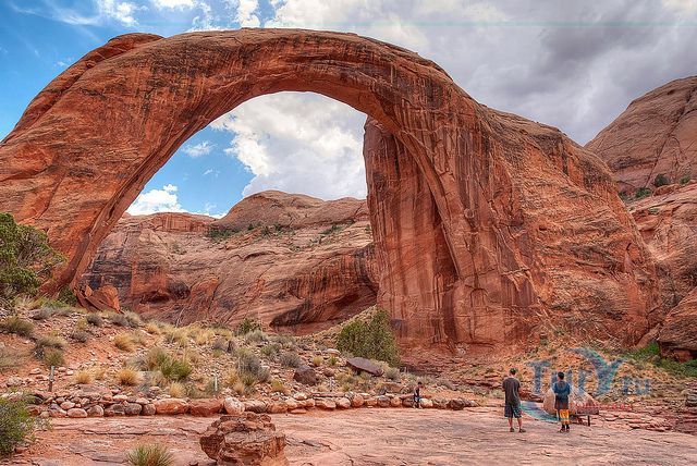 Для индейцев навахо «каменная радуга» являлась священным местом еще и потому, что добраться до этого чуда в прежние времена было очень сложно. В 1910 году арка была объявлена национальным достоянием США, но широкий доступ к ней был открыт лишь в 1963 году с возведением плотины Глен. Образовавшееся в результате озеро Пауэлл повысило уровень воды в реке Колорадо: вместо 20 км опасных троп посетители получили удобные водные переправы.