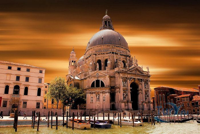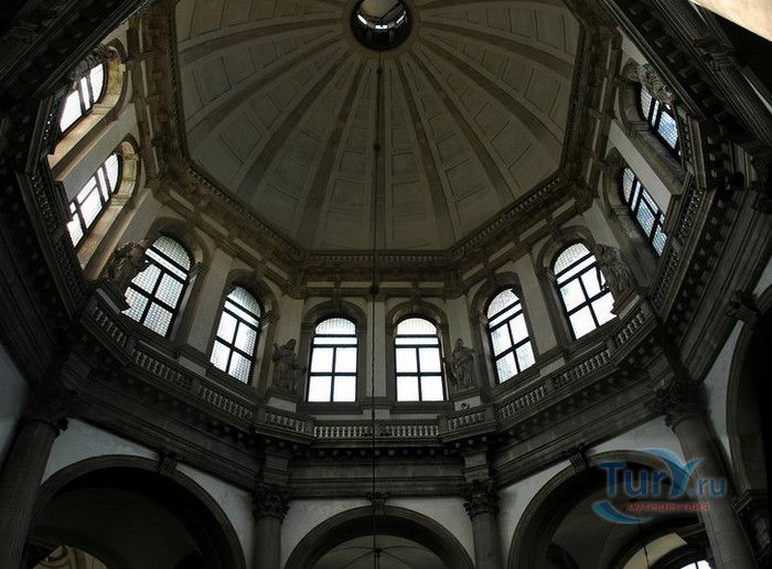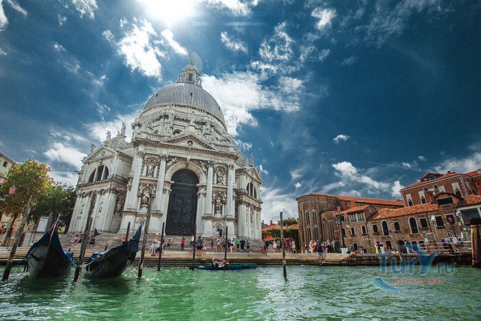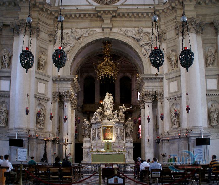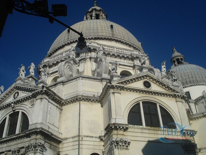 Базилика Санта Мария Делла Салюте (Базилика Здоровья) расположена в Венеции, в районе Пунта делла Догана. В 1630-1631 годах в Венеции свирепствовала эпидемия чумы, унесшая более 10 000 человеческих жизней. История гласит, что не имея возможности справиться с эпидемией, патриарх Джованни Тьеполо и дож Венеции Николо Контарини прилюдно дали обет Святой Деве Марии, что если чума отступит от города и прекратит уносить человеческие жизни, в честь Богоматери будет возведен большой храм. Ни патриарх, ни дож не дожили до закладки первого камня Базилики. Молитвы были услышаны и страшная болезнь отступила. С одобрения Городского Совета в 1631 году по проекту архитектора Бальтазара Лонгена было начато возведение Базилики Санта Мария Делла Салюте. Строительство было завершено только в 1687 году. Из-за постоянно оседающего грунта работы часто прерывались. Для укрепления фундамента и несущих стен, на которые должен был быть установлен большой купол, было использовано более миллиона деревянных балок, 100 000 из которых было забито в дно в качестве свай. Архитектор не дожил до окончания строительства, храм был освящён в 1687 году патриархом Альвизе Сагредо. Базилика представляет собой восьмигранное здание, выполненное в стиле барокко. Центральный белый купол-полусфера установлен на барабан с пятнадцатью рёбрами, в каждом из которых расположены парные окна, обрамлённые арками. Базилика имеет второй купол меньшего размера. Вход в собор имеет вид триумфальной арки. Фасад украшен скульптурами архангела Михаила, Иоанна Предтечи и Девы Марии, тимпанами и пилястрами. Высота купола равна 60 метрам. Внутренне пространство церкви имеет восьмигранную форму, высокие колонны переходят в пилястры, на которые опирается купол. Мраморный пол выложен концентрическими кругами. По периметру Базилики расположены шесть часовен. Центральный алтарь украшен мраморной статуей Мадонны с младенцем, в центре алтаря находится икона Мадонна делла Салюте, привезенная с острова Крит. Боковые капеллы, кроме часовни Антония Падуанского, посвящены Деве Марии. В стенах Базилики Санта Мария Делла Салюте хранится картина "Брак в Кане", написанная Тинторетто в 1561 году. Также есть алтарные образа работы итальянского живописца Луки Джордано - "Рождество", "Вознесение" и "Введение Девы Марии в храм". Стены храма украшают картины великого Тициана - "Сошествие Святого Духа", "Жертвоприношение Авраама", "Давид, убивающий Голиафа" и "Каин и Авель". Ежегодно 21 ноября, в день, когда эпидемия чумы покинула город, перед входом в Базилику собираются гондолы, перекрывающие Гранд-канал и образующие своеобразный мост. По нему в церковь от Дворца дожей проходят паломники, чтобы принять участие в праздничной мессе и в очередной раз восхвалить Деву Марию за избавление ею Венеции от чумы.