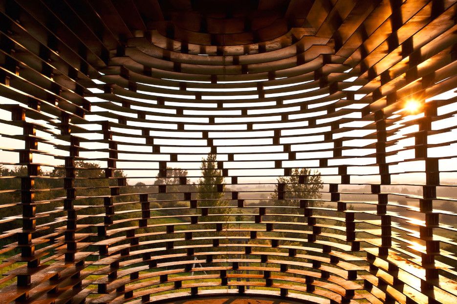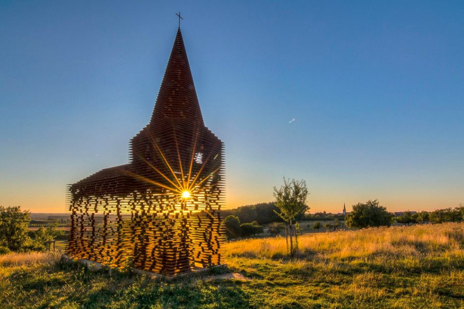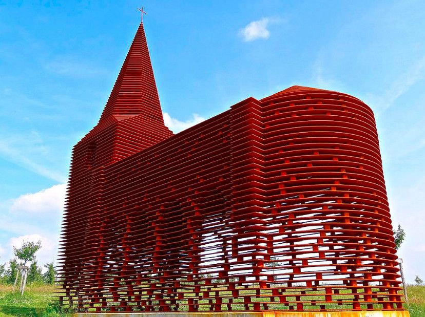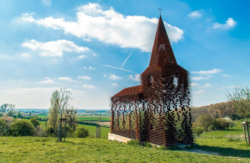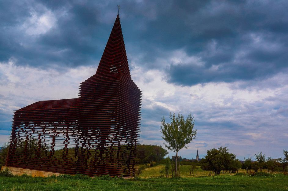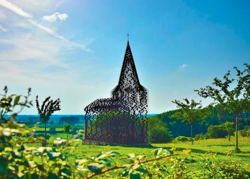 Арт-объект "Читая между строк", известный также под названием "Прозрачная церковь", является проектом студии Gijs Van Vaerenbergh - тандема двух молодых бельгийских архитекторов Петерьяна Гийса и Арноута Ван Ваеренберга. Прозрачная церковь расположена посреди сельского ландшафта, в окрестностях бельгийского города Борглоон, в провинции Лимбур. Необычная "церковь" появилась здесь в 2011 году в рамках художественного проекта Z-OUT ("Искусство в открытом пространстве"). Архитектурная конструкция с одного ракурса выглядит как традиционная католическая церковь с остроконечным куполом и монолитными стенами, с другого - словно растворяется в воздухе, становясь прозрачной и сливаясь с окружающим её ландшафтом. Этот необычный эффект был достигнут архитекторами благодаря использованию нетрадиционных стройматериалов - десятиметровая конструкция состоит из ста горизонтальных слоёв стальных пластин и двух тысяч стальных столбцов, с помощью которых пластины крепятся. Вся конструкция весит 30 тонн, но впечатление создаётся, что церковь воздушна и невесома. Зайдя внутрь сооружения, можно в буквальном смысле увидеть окружающий пейзаж сквозь стены сооружения. Ещё один потрясающий эффект, который можно наблюдать, находясь внутри "церкви", - это игра света и теней, при чём освещение внутреннего пространства церкви меняется в зависимости от положения Солнца и направления солнечного света в разное время суток. Особенно красиво это выглядит в утренние и вечерние часы.