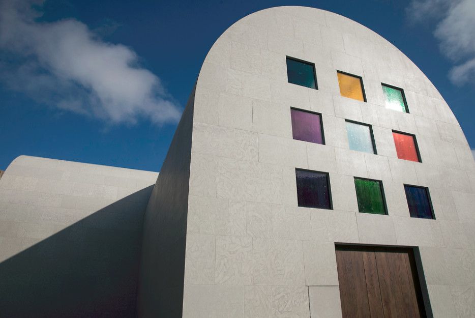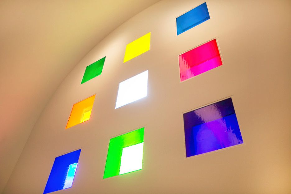 На трёх фасадах здания расположены витражные окна "Цветная сетка", "Звёздная вспышка" и "Барабанные квадраты", каждое из которых имеет свой уникальный дизайн. В общей сложности они состоят из 33 отдельных окон (32 цветных и 1 прозрачного), изготовленных в Мюнхене известной студией архитектурного стекла Franz Mayer of Munich, Inc, основанной в 1847 году .
