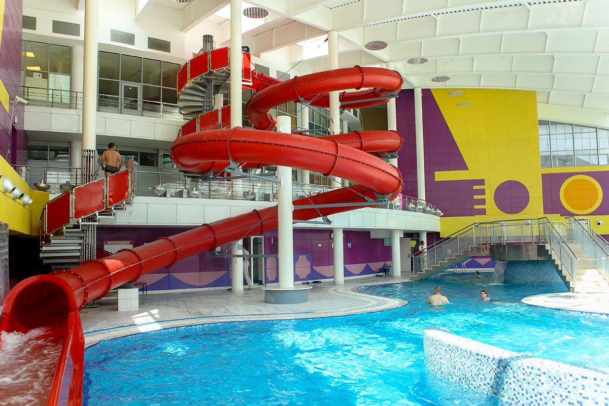 водные аттракционы (детский бассейн, взрослый бассейн, винтовая горка Табоган 72 м, водные гейзеры, джакузи, река с течением, водопад Остров, водопад Ниагара)