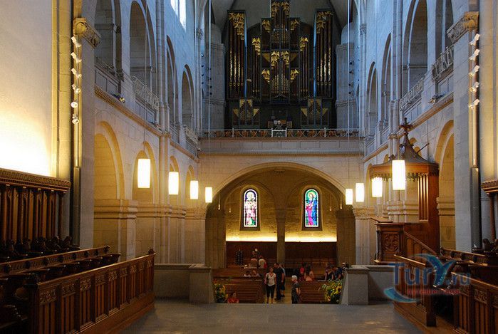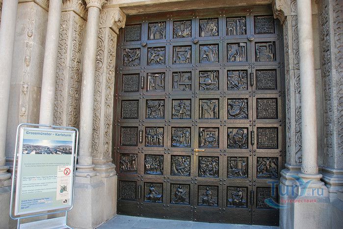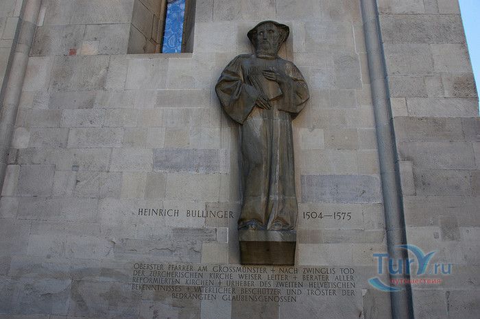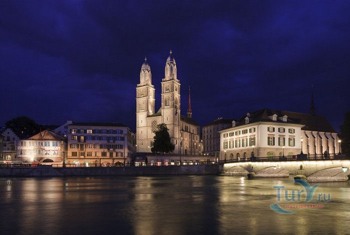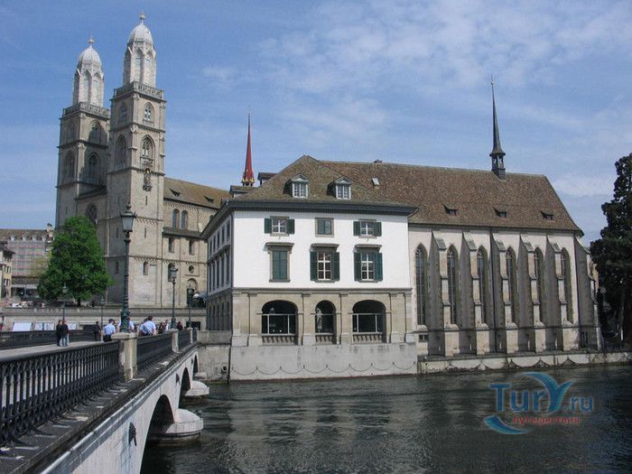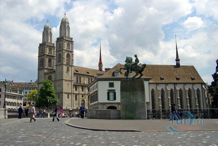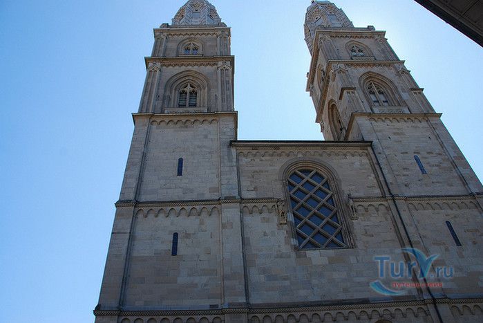 Собор Гроссмюнстер, построенный в романском и готическом стилях содержит две трехэтажные башни и располагается на террасе над Limmatquai, на правом берегу. Строительство собора началось в 1090 и достраивалось до начала XIV века. Хоры содержат великолепные витражи, выполненные в 1932 году Августо Джакометти. Старейшие части собора датируются концом XI, началом XII веков. Можно отметить крытую галерею в романском стиле со скульптурами конца XII века. Когда-то этот собор был приходской церковью Ульриха Цвингли - одного из великих лидеров Реформации. Он убедил священников жениться (сам он был женат), выступал против "идолопоклонства" и массового причащения. В 1531 году Цвингли был убит в религиозной войне в Каппеле. Палач четвертовал его тело и солдаты сожгли остатки. На месте его казни надпись - "Они могут убить тело, но не душу". В соответствии с убеждениями Цвингли, Гроссмюнстер - строгий, без обильных украшений. Находящаяся там ранее церковная школа была заменена в 1853 году первой школой для девочек (Wegmann); сегодня это здание теологического факультета Университета.