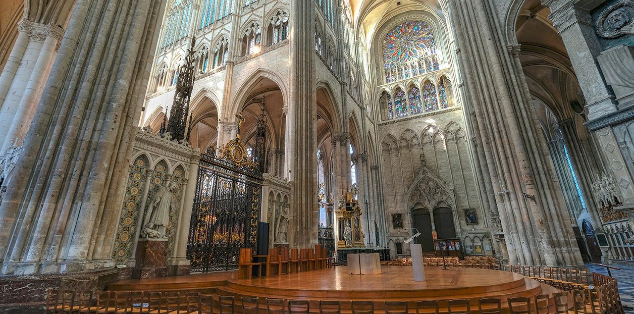 Внутреннее пространство собора поражает своими огромными размерами и великолепием. Несмотря на то, что интерьер Амьенского собора - самый большой среди готических соборов Франции, он не подавляет своими размерами, а, наоборот, кажется лёгким и на удивление гармоничным. Звёздчатый нервюрный свод собора поддерживают 126 колонн, огромные витражные окна наполняют светом буквально каждый уголок внутреннего пространства, а за счёт плавного "перетекания" трёхнефной входной части в трёхнефный трансепт и далее - в пятинефный хор, всё пространство собора воспринимается как единое целое.