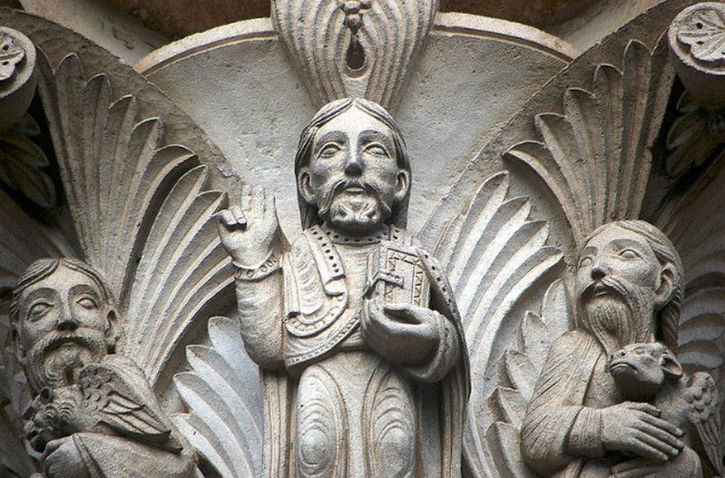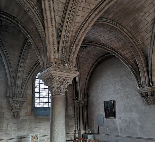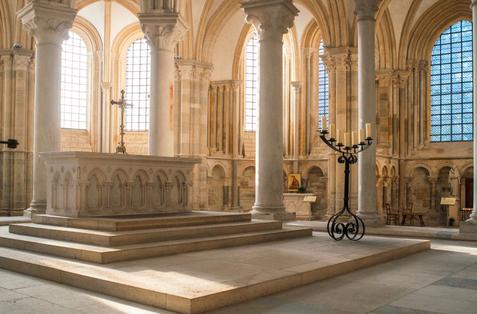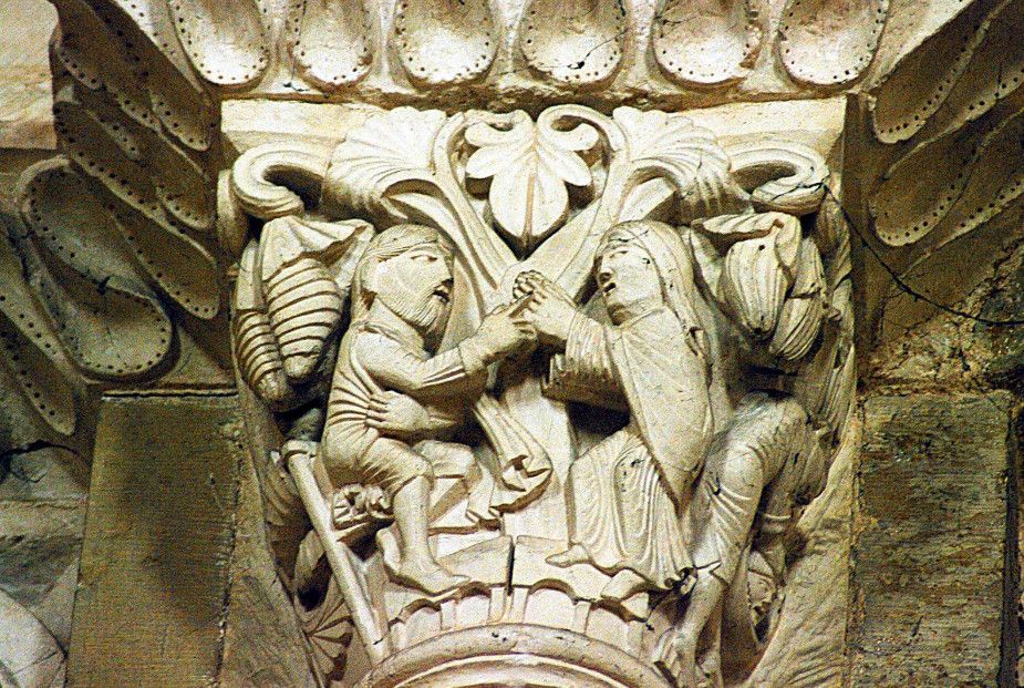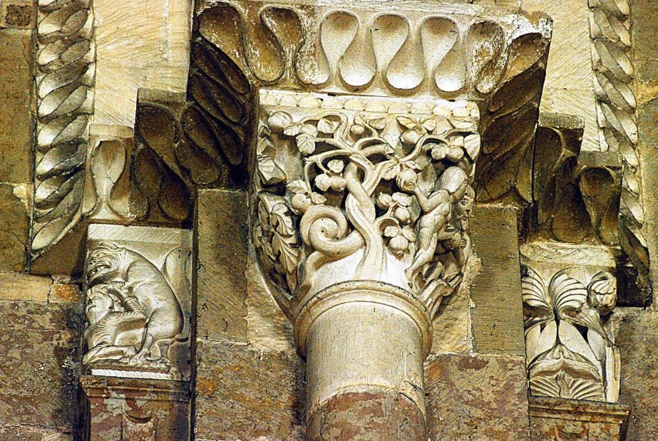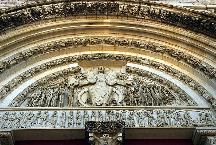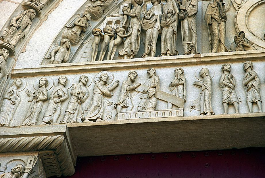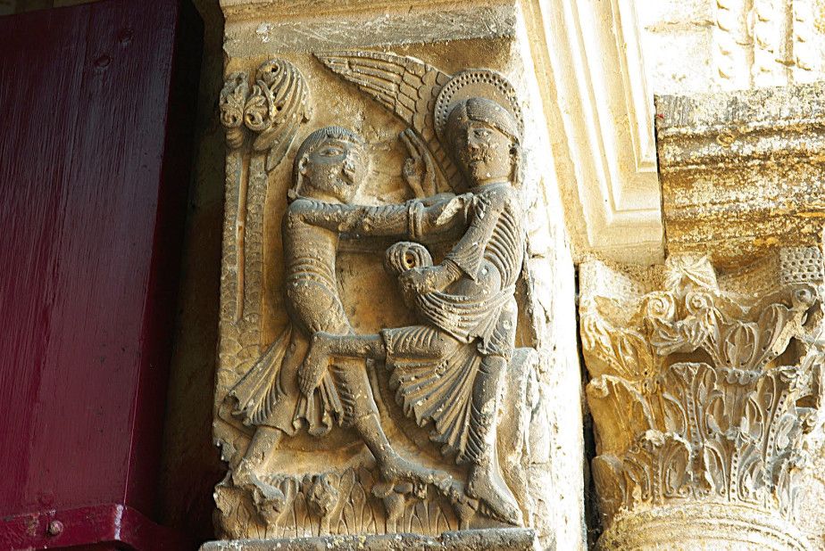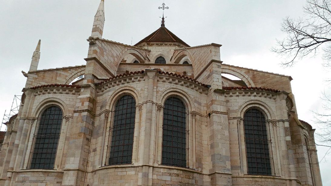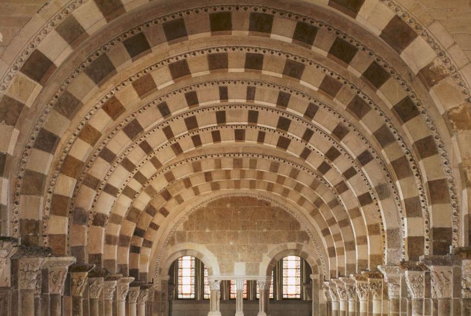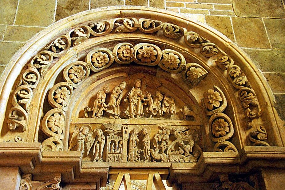 Чтобы иметь возможность разместить всех паломников, прибывающих в аббатство, в 1096 году было начато строительство церкви в романском стиле. Деньги на строительство собирали с крестьян, "приписанных" к монастырю. Непосильные поборы стали причиной вспыхнувших в 1106 году крестьянских волнений, в ходе которых был убит настоятель монастыря. Тем не менее, работы по возведению церкви не прекращались. Во время строительства храм несколько раз горел, но всё время восстанавливался. Наконец, в 1132 году папа Иннокентий II освятил просторный нартекс (притвор) храма, в 1135 году было завершено возведение нефа церкви.