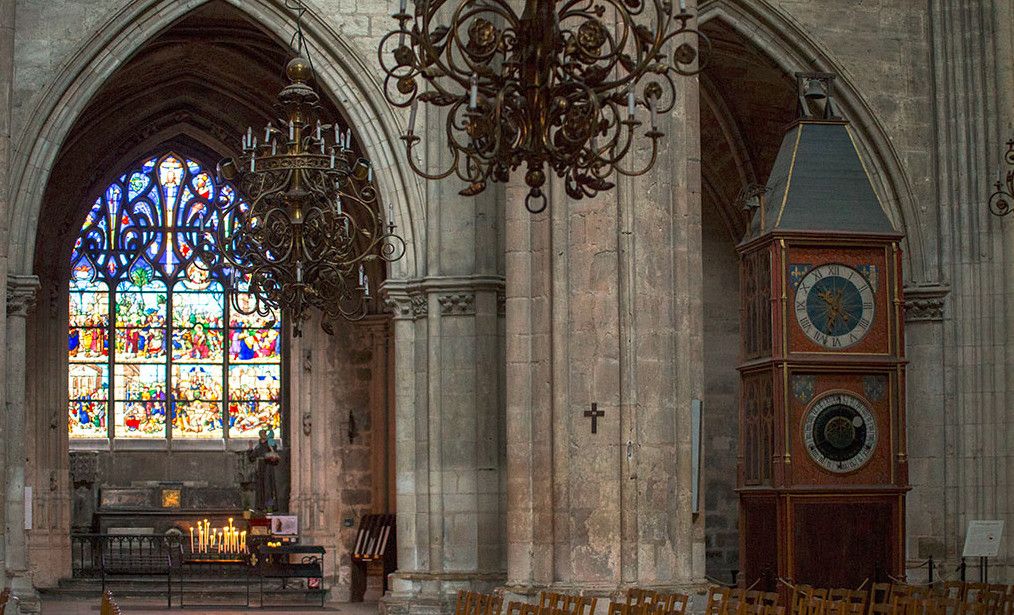 Интерьер собора был спланирован по принципу "единства внутреннего пространства" - высокие 37-метровые своды нефа, отсутствие внутренних осевых опор, большие оконные проёмы создают эффект единого огромного пространства, от которого буквально захватывает дух. Убранство внутренних помещений изобилует скульптурами, статуями, картинами, фресками и барельефами. Одно из сокровищ собора - старинные астрономические часы, изготовленные в 1424 году и прекрасно сохранившиеся до наших дней. Под деамбулаторием расположена крипта, построенная в 1200 году, в которой находится гробница герцога Жана Беррийского.