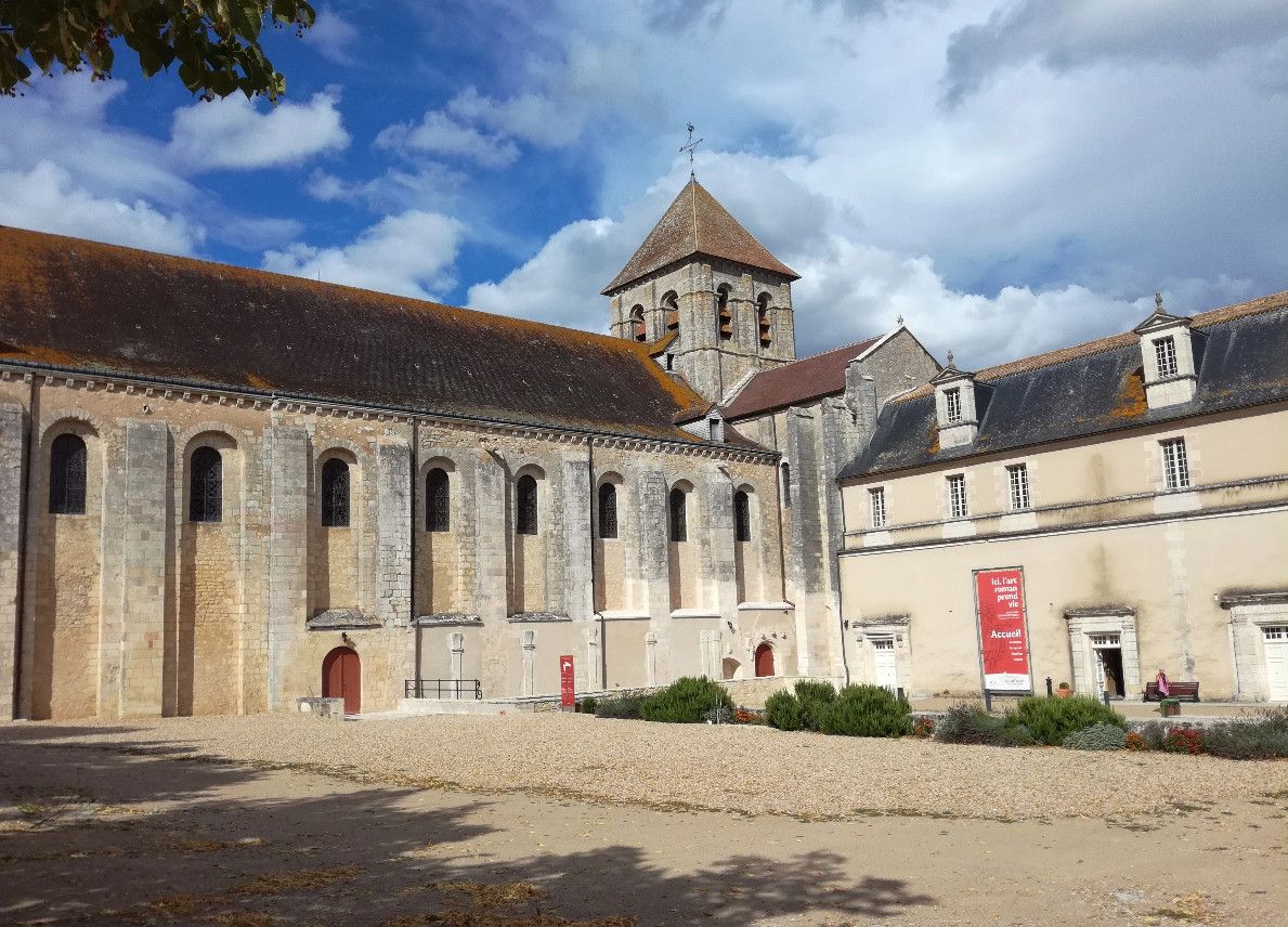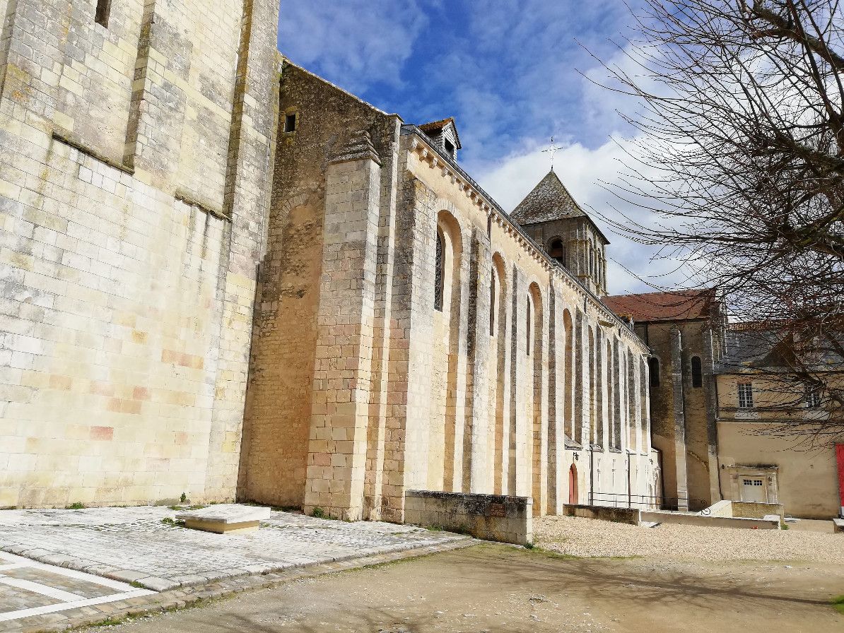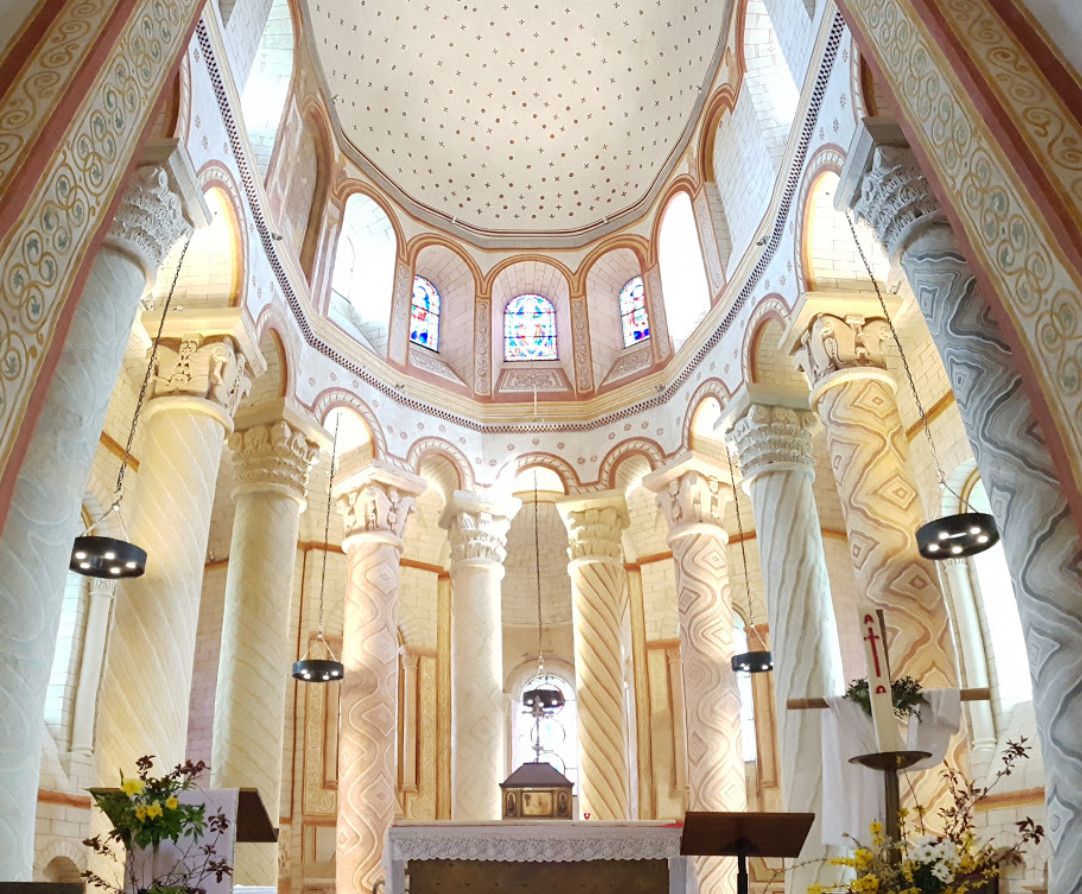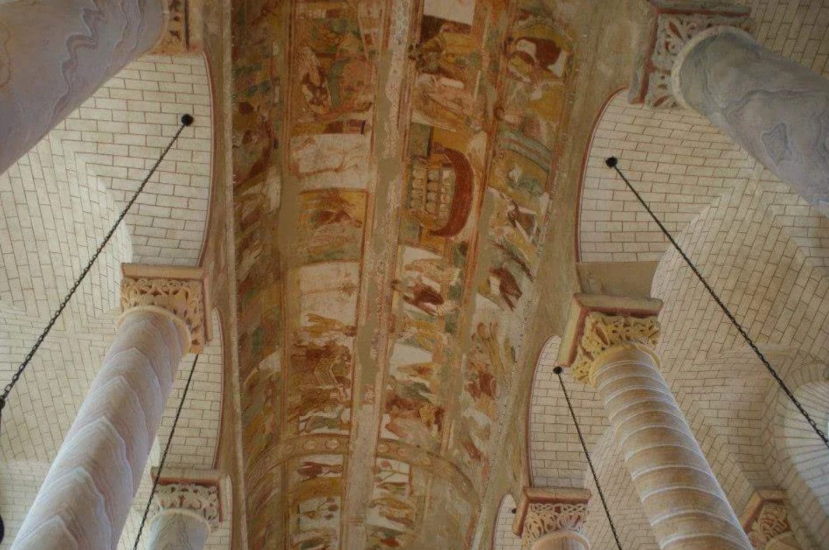 В 1010 году супруга Гильома V Великого, герцога Аквитании и графа Пуату, пожертвовала аббатству большую сумму денег, позволившую начать строительство новой церкви взамен старой, построенной ещё во времена Каролингов. Возведение церкви в романском стиле велось в 1040-1090 годах. Церковь впечатляет своими размерами, её длина - 76 метров, высота колокольни - 77 метров, а длина трансепта - 31 метр. Длина центрального нефа - 42 метра, ширина и высота - 17 метров, он отделён от боковых проходов рядами 15-метровых колонн с капителями. Боковые нефы с крестовыми сводами не уступают центральному нефу по ширине и высоте. Солнечный свет, проникающий внутрь церкви через боковые арочные окна и окна эркера, хорошо освещает главное сокровище храма - старинные фески, которыми полностью расписаны свод главного нефа (площадь росписей составляет 460 квадратных метров), стены нартекса (притвора) и крипты Святых Савена и Киприана. Эти фрески датируются XI-XII веками, на них изображены сюжеты из Апокалипсиса, Страстей Христовых и около пятидесяти эпизодов Ветхого Завета, взятых из Книг Бытия и Исхода, - 16 фресок цикла "Сотворение людей», целый цикл, посвящённый Всемирному потопу и Ною, а также сюжеты на темы "История Вавилонской башни", "История о Каине и Авеле", "История Авраама", "История Иосифа", "История Иакова", "История Моисея". Имена живописцев, создавших эти художественные шедевры, остались неизвестными. Скорее всего, это были мастера местной живописной школы, использовавшие при написании фресок совсем небольшой набор красок - жёлтую и красную охру, зелёный и голубой пигменты (последний встречается очень редко, так как в то время был очень дорогим). Для создания многоцветной палитры и оттенков художники смешивали основные цвета с чёрной и белой красками. А в результате - произведение искусства, признанное "шедевром человеческого творческого гения".