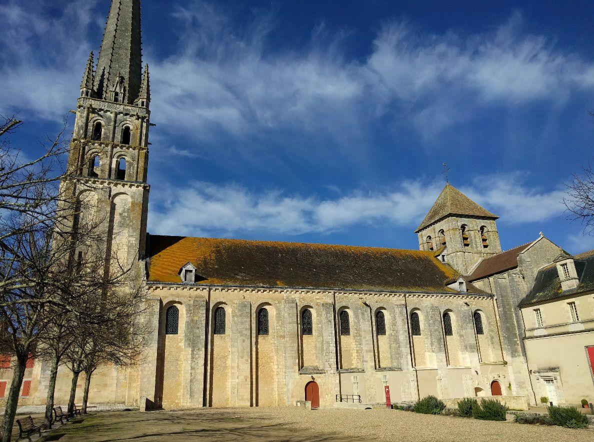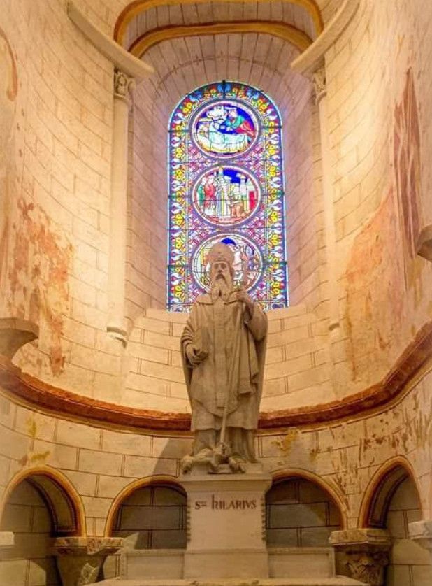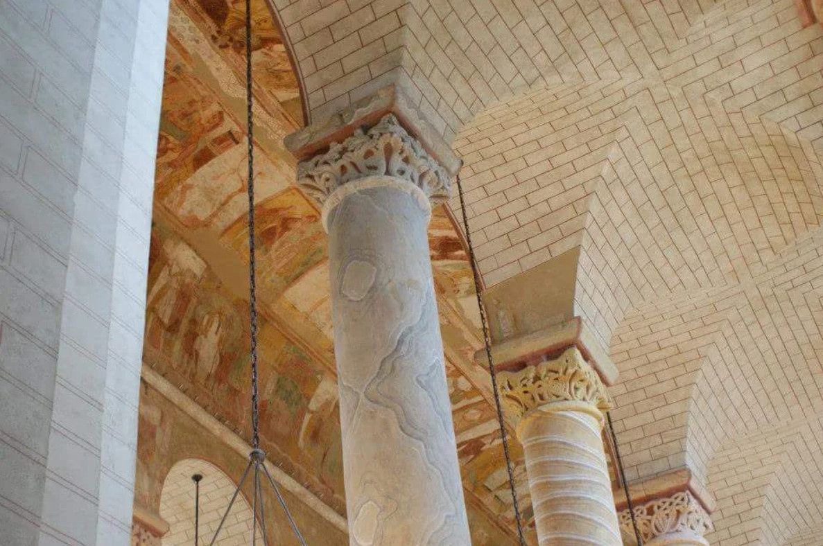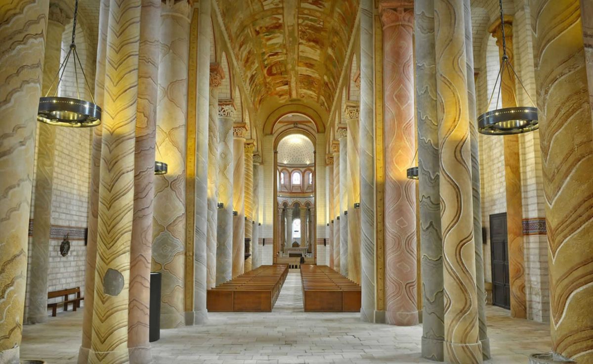 В 1010 году супруга Гильома V Великого, герцога Аквитании и графа Пуату, пожертвовала аббатству большую сумму денег, позволившую начать строительство новой церкви взамен старой, построенной ещё во времена Каролингов. Возведение церкви в романском стиле велось в 1040-1090 годах. Церковь впечатляет своими размерами, её длина - 76 метров, высота колокольни - 77 метров, а длина трансепта - 31 метр. Длина центрального нефа - 42 метра, ширина и высота - 17 метров, он отделён от боковых проходов рядами 15-метровых колонн с капителями. Боковые нефы с крестовыми сводами не уступают центральному нефу по ширине и высоте. Солнечный свет, проникающий внутрь церкви через боковые арочные окна и окна эркера, хорошо освещает главное сокровище храма - старинные фески, которыми полностью расписаны свод главного нефа (площадь росписей составляет 460 квадратных метров), стены нартекса (притвора) и крипты Святых Савена и Киприана. Эти фрески датируются XI-XII веками, на них изображены сюжеты из Апокалипсиса, Страстей Христовых и около пятидесяти эпизодов Ветхого Завета, взятых из Книг Бытия и Исхода, - 16 фресок цикла "Сотворение людей», целый цикл, посвящённый Всемирному потопу и Ною, а также сюжеты на темы "История Вавилонской башни", "История о Каине и Авеле", "История Авраама", "История Иосифа", "История Иакова", "История Моисея". Имена живописцев, создавших эти художественные шедевры, остались неизвестными. Скорее всего, это были мастера местной живописной школы, использовавшие при написании фресок совсем небольшой набор красок - жёлтую и красную охру, зелёный и голубой пигменты (последний встречается очень редко, так как в то время был очень дорогим). Для создания многоцветной палитры и оттенков художники смешивали основные цвета с чёрной и белой красками. А в результате - произведение искусства, признанное "шедевром человеческого творческого гения".