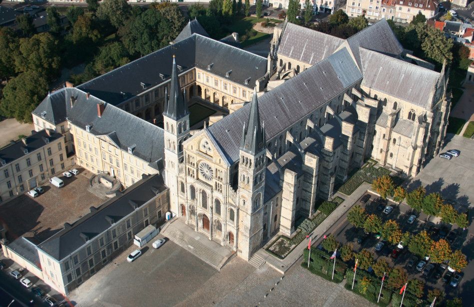 Святой Ремигий скончался в 533 году и был похоронен в часовне Святого Христофора, которая в те времена располагалась на самой окраине Реймса, за пределами его городских стен. Из-за огромного наплыва паломников на месте часовни вскоре была построена более просторная церковь, в которую и перенесли мощи святого. В 760 году архиепископом Жаном Турпином на месте захоронения Святого Ремигия было основано бенедиктинское аббатство Сен-Реми.