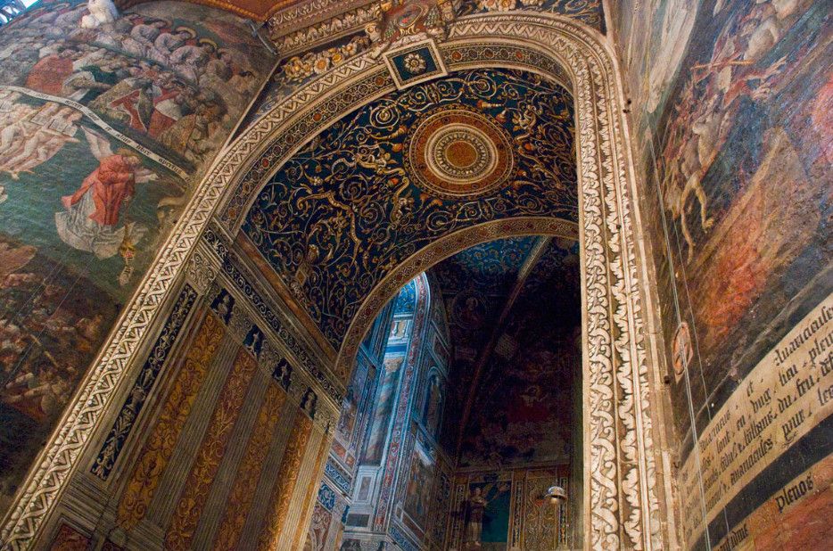 В 1474-1484 годах собор "получил" великолепный хор с лекторием (Кафедральный собор Сент-Сесиль - единственный собор во Франции, в котором полностью сохранился весь хор), богато украшенный каменными барельефами, ажурными арками, филигранной каменной резьбой и полихромными статуями работы бургундских мастеров. В 1495 году всю поверхность стены ниже органа собора заняла фреска "Страшный суд", предположительно, работы фламандских мастеров. Первоначально площадь фрески составляла почти 300 квадратных метров, однако, в конце XII века часть её была утрачена, и сегодня её площадь - 200 квадратных метров. В 1509-1514 годах весь сводчатый потолок собора был украшен великолепными росписями, признанными шедевром монументальной живописи. Общая площадь фресок составляет 18 500 квадратных метров - это крупнейший и старейший ансамбль итальянской живописи эпохи Возрождения во Франции.