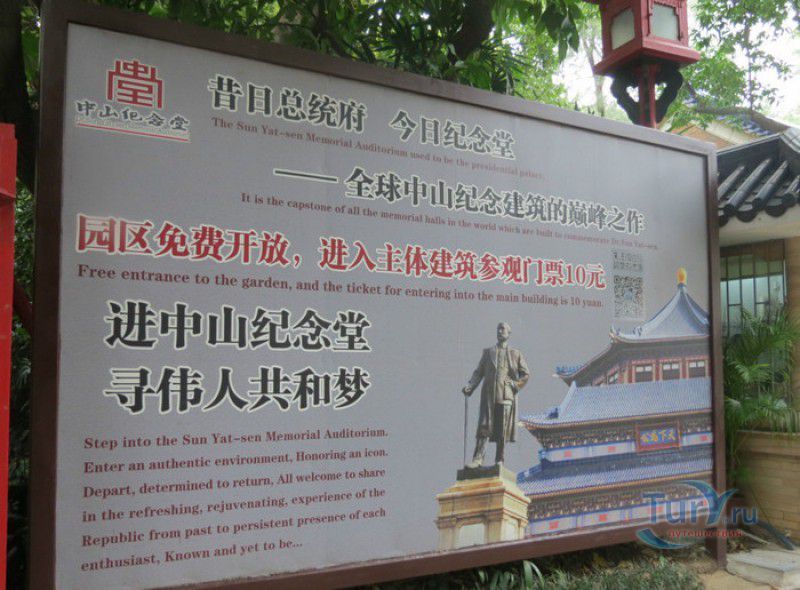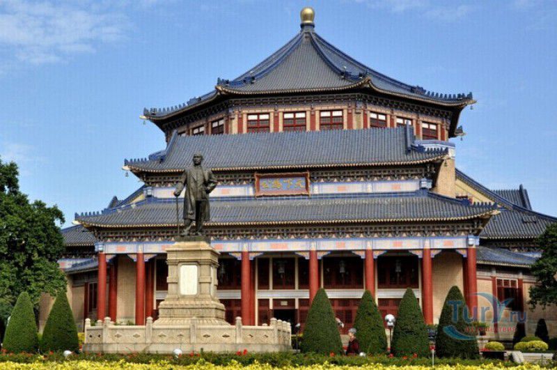 Мемориальный Зал Сунь Ятсена расположен в городе Гуанчжоу, у подножия южного склона горы Юэсю. Место для строительства Мемориала было выбрано не случайно - ранее на этом месте располагалась официальная резиденция первого президента Китайской Республики, "отца нации" Сунь Ятсена, в которой в 1912 году состоялась церемония принесения им президентской присяги. Средства на строительство Мемориала одному из самых почитаемых в Китае политических деятелей собирали жители Гуанчжоу и представители китайской диаспоры со всего мира. Здание в традиционном китайском стиле было построено в 1929-1931 годах по проекту архитектора Лу Яньчжи, оно имеет восьмиугольную форму и занимает площадь 6600 квадратных метров. Применение самых современных для того времени строительных технологий позволило обойтись без колонн и свай, поддерживающих потолок. Огромный купол центрального зала опирается лишь на несущие боковые стены, оставляя пространство под ним полностью свободным, не разделённым перегородками и опорами. В 1956 году перед Мемориалом была установлена 5-метровая бронзовая статуя Сунь Ятсена, а в 1998 году проведена полная реконструкция комплекса. Мемориал Сунь Ятсена, зал которого может вместить до двух тысяч человек, часто используется для проведения конференций и заседаний, здесь также проходят концерты и спектакли. В зале находится галерея с фотографиями и письмами Сунь Ятсена. На территории Мемориального комплекса разбит большой парк, в котором растут старейшая в Гуанчжоу сейба (хлопковое дерево), которую считают ровесницей города, а также два самых больших в Гуанчжоу дерева белой магнолии. Посетители Мемориала Сунь Ятсена могут прогуляться по аллеям парка, насладиться тишиной и покоем, отдохнуть от городской суеты.