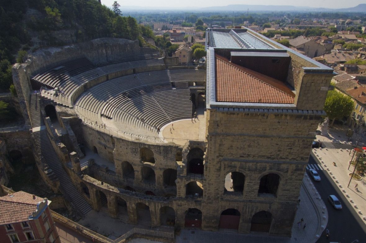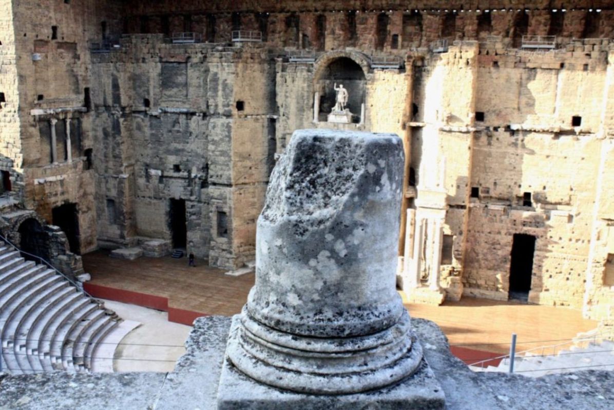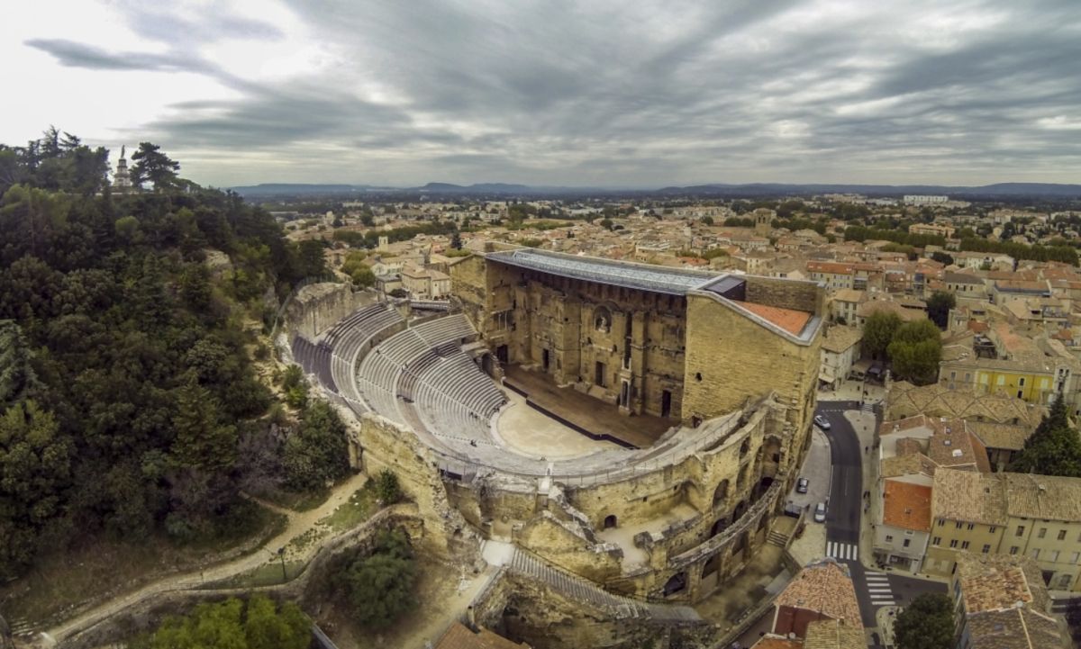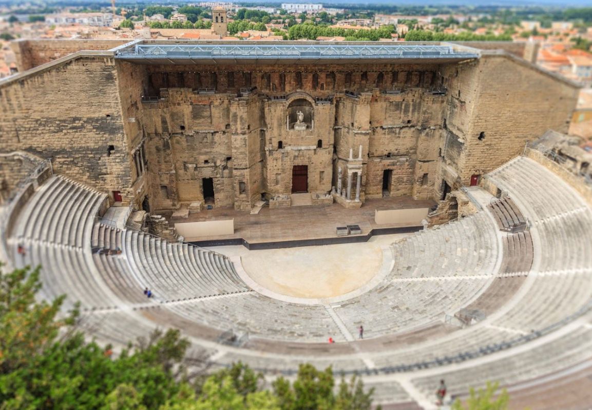 Когда-то город Оранж назывался Араузионом. Город был основан в 36 году до нашей эры ветеранами Второго галльского легиона в римской провинции Нарбонская Галлия, на земле, подаренной своим верным воинам императором Октавианом Августом. Город стал быстро развиваться, и уже спустя всего несколько десятилетий численность его населения достигла 110 000 жителей. Для того, чтобы отвлечь от политических и экономических проблем горожан, значительную часть которых составляли недовольные властью римлян галлы, в Араузионе, как и во многих крупных римских городах, был построен театр. Он стал одним из самых больших и красивых театров на всей территории Римской империи. Недаром намного позже, когда Оранж, уже входил в состав Франции, посетивший его Людовик XIV так отозвался о внушительном фасаде театра: "Это самая красивая стена моего королевства". Фасад Античного театра представляет собой стену длиной 103 метра, толщиной 1,8 метра и высотой 37 метров. Фасад состоит из трёх уровней. На первом уровне, между аркадами, располагались три входа, ведущих на сцену. Второй уровень был декоративным - его украшали растительный орнамент и мозаика. Третий уровень, оформленный аркатурным поясом, служил опорой для навесной деревянной крыши, которая защищала актёров и зрителей от дождя или жары.