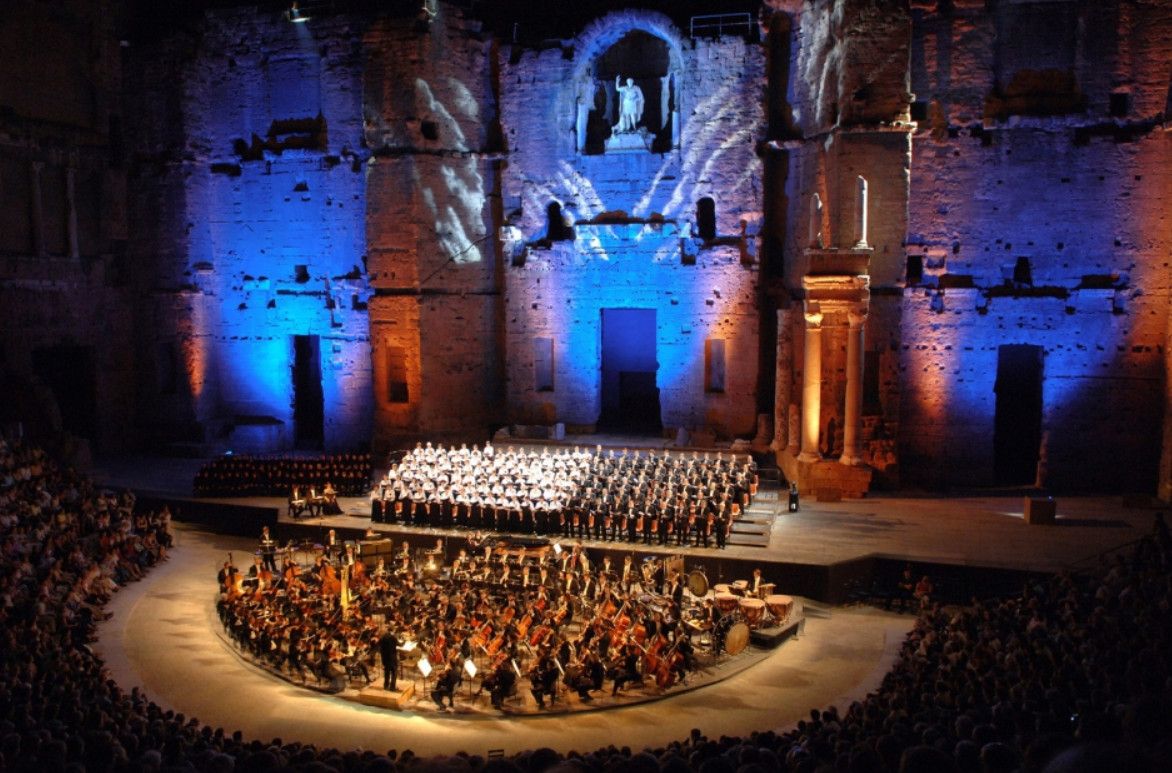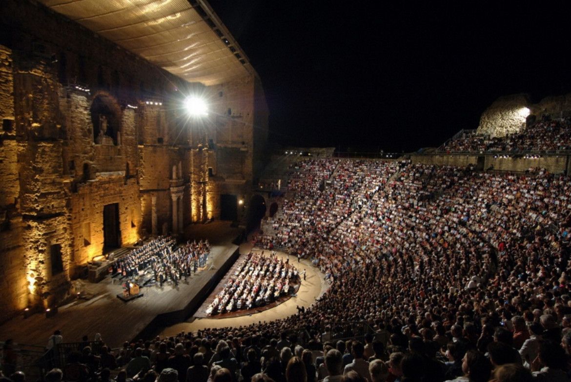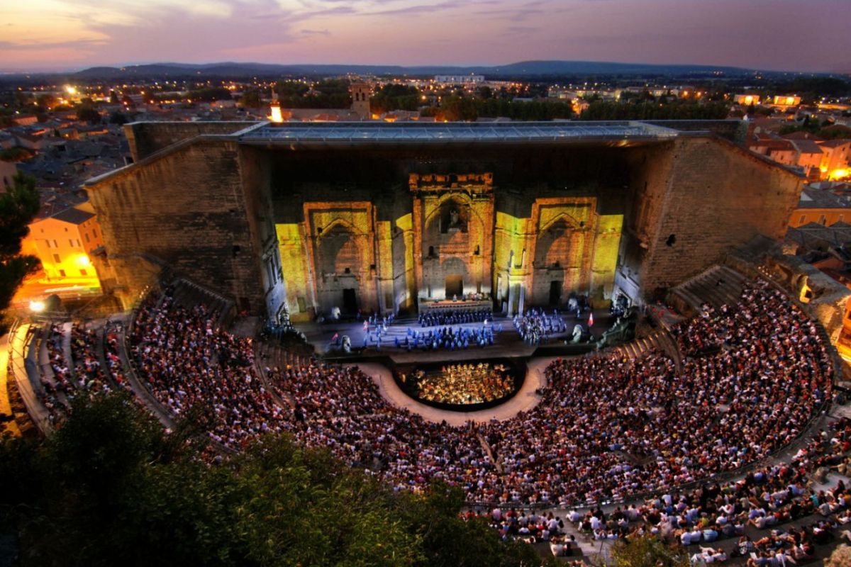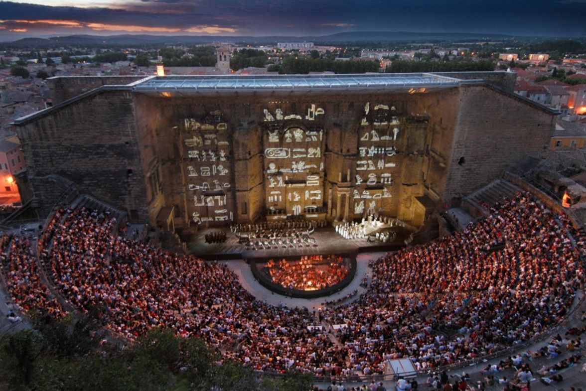 К началу XIX века некогда великолепный Античный театр представлял собой жалкое зрелище - развалины, свалки мусора и грязные лачуги нищих. Наверное, со временем театр либо развалился бы сам, либо его б снесли. Своим спасением он обязан известному французскому писателю Просперу Мериме, который занимал в то время должность главного инспектора исторических памятников Франции. Именно по его инициативе в 1825 году началась реставрация Античного театра в Оранже - сооружение было полностью расчищено, лачуги снесены, а на сцене театра даже стали показывать представления. В 1869 году на сцене Античного театра впервые прошёл оперный фестиваль Римские празднества, ставший с 1902 года ежегодным и переименованный в Хорегии Оранжа (Chorégies d’Orange). В разное время здесь выступали Сара Бернар, Пласидо Доминго, Барбара Хендрикс, Монсеррат Кабалье, Руджеро Раймонди, Ферруччо Фурланетто. Постановки знаменитых оперных произведений осуществляются с большим размахом, благодаря чему в Оранж приезжают тысячи поклонников оперного искусства со всего мира.