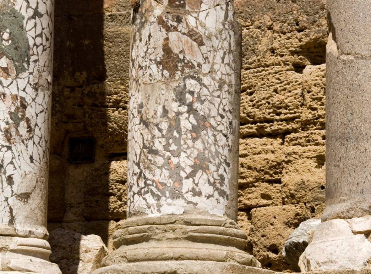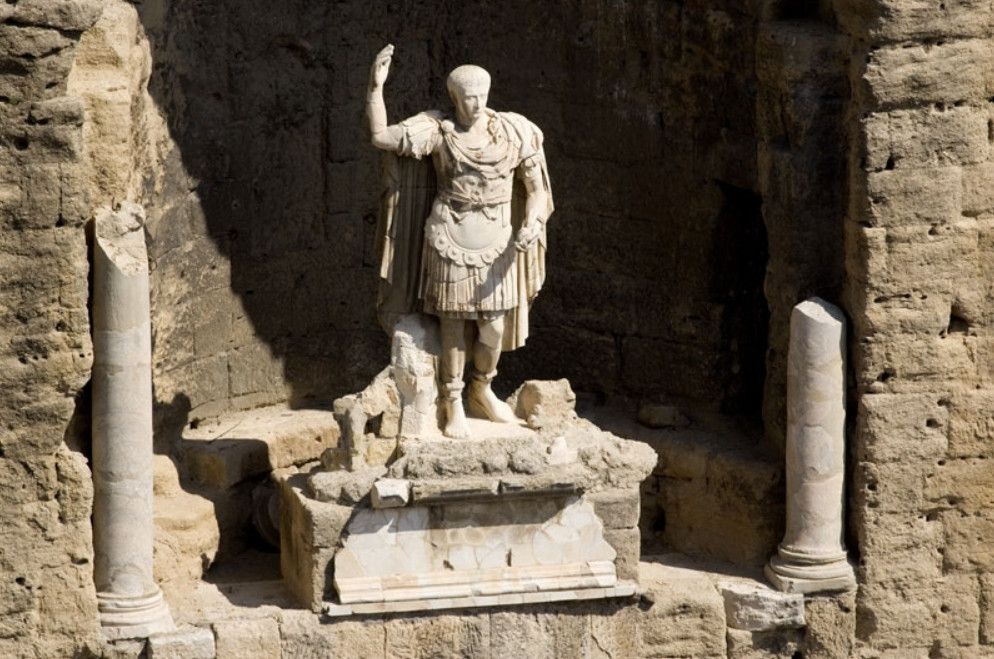 Стена театра со стороны сцены была украшена мраморными медальонами, декоративным фризом, колоннами и статуями, установленными в нишах. В центральной нише стояла статуя императора Августа высотой 3,55 метра.