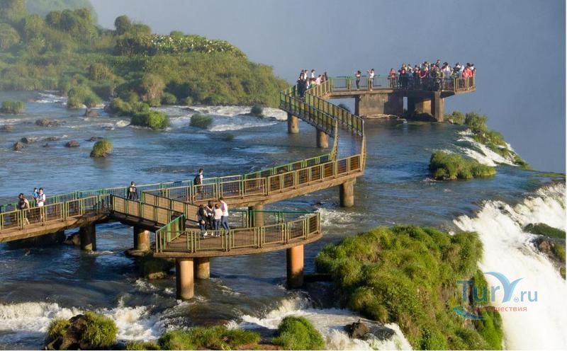 Водопады Игуасу расположены на территории двух одноименных национальных парков «Игуасу» (Аргентинский и Бразильский), занимающих территорию в 67 720 гектаров. Это система, состоящая из 275 водопадов, расположенных в Средне-Атлантических лесах, находится в 17 километрах от устья реки Рио-Игуасу, на реке Парана, в точке, в которой пересекаются границы Аргентины, Бразилии и Парагвая. Название Игуасу, на языке Гуарани расшифровывается как «Большая вода» («I» - вода и «Guasu» - большой). Водопады образовались после сильного вулканического извержения, в результате которого в земле образовалась большая расщелина. Существуют несколько индейских легенд, по которым боги разрезали реку, чтобы помешать влюбленной паре уплыть на каноэ от их гнева. То ли сам верховный бог захотел жениться на индейской девушке, и она от него сбежала, то ли влюбленная пара сбежала из племени без родительского благословления, но в обоих случаях боги страшно покарали влюбленных. Как бы там ни было, базальтовые отложения, по которым стекают водопады, возникли примерно 130 —140 миллионов лет назад. В то время водопады располагались практически на месте впадения реки Игуасу в Парану. Однако каждый год расстояние между водопадом и рекой Парана увеличивалось примерно на 1—2 метра, в результате чего получилось, что водопад «отполз» от своего места рождения на 28 километров. Археологические объекты, найденные на территории парка, говорят о том, что первыми обитателями этих краев считаются индейские племена «кайнганг» и «гуарани». Европейцы открыли водопады в 1541 году, во время экспедиции в поисках страны Эльдорадо. Первооткрывателем водопадов принято считать испанского конкистадора, исследователя Нового Света Кабеса де Вака. Именно он в 1541 году захватил страну индейцев Гуарани, назвал её провинцией Веры и забрал в власть свои руки. Однако водопады не произвели сильного впечатления на колонизатора. Он назвал их испанским словом «Сonsiderable», то есть «значительный». Первым владельцем этих земель был землевладелец, бизнесмен, политик, меценат и филантроп Аргентины José Gregorio de Lezama. Однако он не видел в «куске джунглей, граничащих с несколькими водопадами», особой ценности. Поэтому земля была продана с публичного аукциона за бесценок. Следующим владельцем данных земель был Domingo Ayarragaray. Именно он начал развивать инфраструктуру парка. Был построен первый отель, началось строительство дорог, ведущих к водопадам. Вскоре парк был приобретен Аргентинским правительством, под управлением президента Иполито Иригойена. 9 октября 1934 года земли «Игуасу» были объявлены Национальным парком. Своей природой и климатом парк «Игуасу» напоминает тропики амазонских лесов, наиболее богатых биологическим разнообразием. Климат тропический сухой. Средняя температура воздуха колеблется от 14°C зимой до 24ºC летом. Осадков выпадает 1800 миллиметров в год, сезон дождей - летом. Леса здесь многоуровневые, самый высокий уровень крон деревьев называется «канопи», ниже — ещё несколько «ступеней» более низких деревьев. На самом нижнем уровне кустарников и трав произрастают разные виды «йерба матэ», из которых заваривают популярный в Аргентине чай. Орхидеи растут прямо на стволах деревьев. Пышные джунгли парка изобилуют лианами, эпифитами и папоротниками. Кроме того, прибрежные леса располагаются на задворка