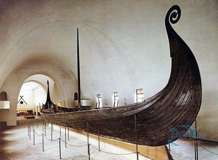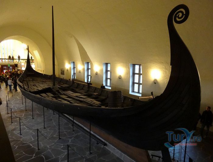 В Музее Кораблей Викингов в Осло представлены три старинных корабля викингов: Осерберг, Гокстад и Туне, а также предметы, обнаруженные в них. Осербергский корабль был обнаружен 8 августа 1903 года профессором Габриэлем Густафсоном во время археологических раскопок кургана близ местечка Осерберг. После завершения раскопок на восстановление и реставрацию корабля понадобился 21 год. Корабль был построен в 820 году, в 834 году был использован для погребения двух женщин знатного рода. Он был изготовлен из древесины дуба, вмещал 30 гребцов, сосновая мачта достигала в высоту 13 метров. Киль украшают резной орнамент и искусно вырезанная фигура животного, что может свидетельствовать о принадлежности судна знатному роду. При захоронении на корабле женщин, на палубе была построена гробница, внутренние стены которой были украшены гобеленами. По обычаю, в потусторонний мир усопших сопровождали животные (в кургане были обнаружены скелеты шести собак, пятнадцати лошадей и двух коров), одежда, текстиль, посуда, сани, телега, украшения и богатые подарки от родственников. Гокстадский корабль был обнаружен двумя подростками в 1879 году в Царском кургане, расположенном рядом с фермой Гокстад. В 1880 году были начаты археологические раскопки, в результате которых был обнаружен корабль викингов, построенный в 885 - 892 годах нашей эры. Корабль мог вместить экипаж из 34 человек, с каждого борта есть 16 отверстий для вёсел. Изготовлен корабль из древесины дуба, палуба и мачта - из сосны. Благодаря лабораторным исследованиям установлено, что в 900 году корабль был использован для погребения знатного мужчины, погибшего в бою. В задней части корабля была построена гробница, покрытая несколькими слоями коры. Археологи нашли следы шёлковых тканей с золотыми нитями, остатки дорогих ковров. В гробнице были обнаружены 64 щита, рыболовные снасти из свинца, железа и золочёной бронзы, палатка, сани, три небольших лодки, скелеты 12 лошадей, 8 собак, двух ястребов и двух павлинов. Украшения и богатое оружие были украдены их кургана, скорей всего, ещё во времена викингов. Тунский корабль был найден в 1867 году в кургане возле фермы Нижняя Хауген. Корабль был построен в 900 году, мог вместить экипаж из 24 человек и предназначался для перевозки грузов и товаров. Из-за быстрых и неосторожных раскопок корабля, он был значительно повреждён, многие предметы, находившиеся на корабле, так и не дошли до музея. По оставшимся предметам в гробнице учёные сделали вывод, что на корабле был погребён мужчина знатного рода. В 1913 году профессор Габриэль Густафсон предложил создать музей для трёх обнаруженных кораблей. Он был построен по проекту известного норвежского архитектора Арнберга. В 1926 году был готов зал для размещения Осебергского корабля, в 1932 году - залы для Гокстадскго и Тунского кораблей. Полностью музей был достроен в 1957 году. В настоящее время ведутся работы по строительству нового здания для Музея Кораблей Викингов, новый комплекс будет в три раза больше, чем существующий музей.