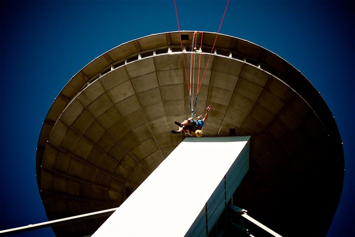 Посетитель защищен двумя стальными канатными системами и имеет возможность попытаться наклониться через край прохода в трех заданных точках.