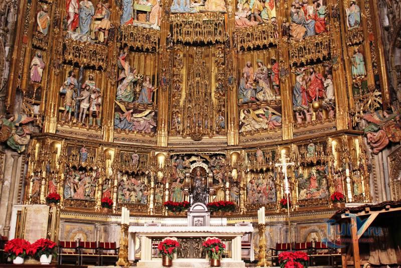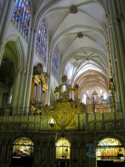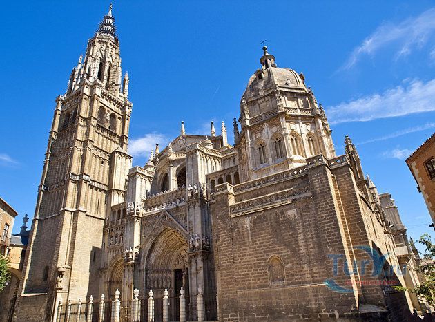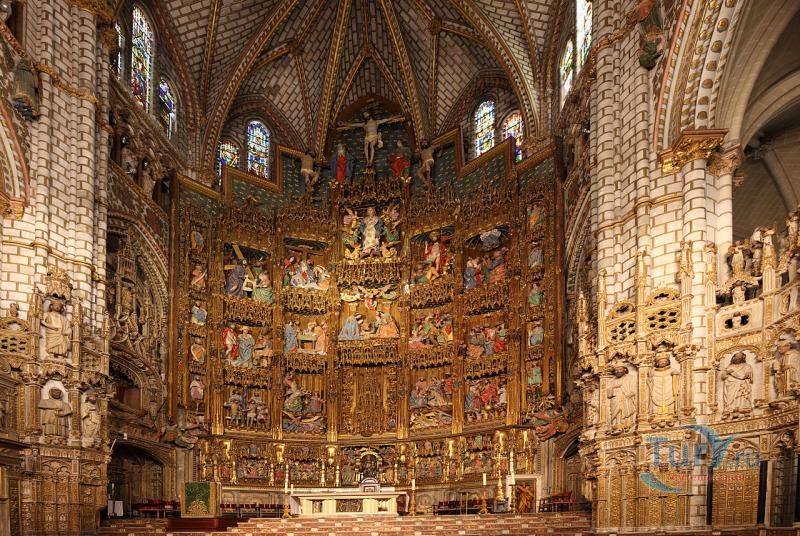 Собор в Толедо считается одним из величайших готических сооружений Европы. Внутри собор содержит великие шедевры, включая потрясающий главный алтарь в стиле барокко и две картины работы Эль Греко. Собор Толедо был построен с 1226 по 1493 года, долгий процесс строительства отражал разнообразие стилей. Внутри среди множества сокровищ собора высится алтарь Эль Транспаренте - стена из мраморных и причудливых алебастровых скульптур, плохо различаемых вследствие бедного освещения собора. Скульптор Нарциско Томе проделал отверстие в потолке и сейчас свет попадает на парящих ангелов, Тайную вечерю в алебастре. Мозарабская капелла XVI века работы Хуана де Боргона, еще одна достопримечательность собора. Шедевры собора включают "Арест Христа на горе олив" Гойи и работу Эль Греко "Двенадцать апостолов и снятие одежд с Христа". Эта работа Эль Греко в Толедо была запрещена Инквизицией, Эль Греко был брошен в тюрьму, и его карьера могла бы закончиться, если бы ни его дружба с некоторыми более умеренными священниками Толедо.