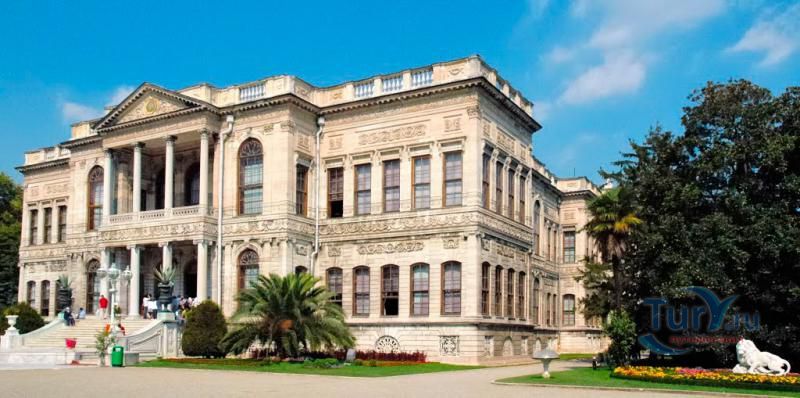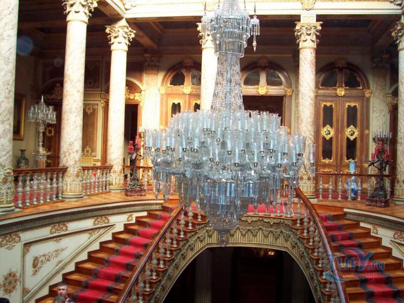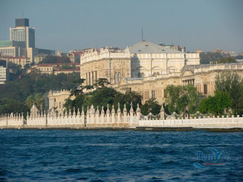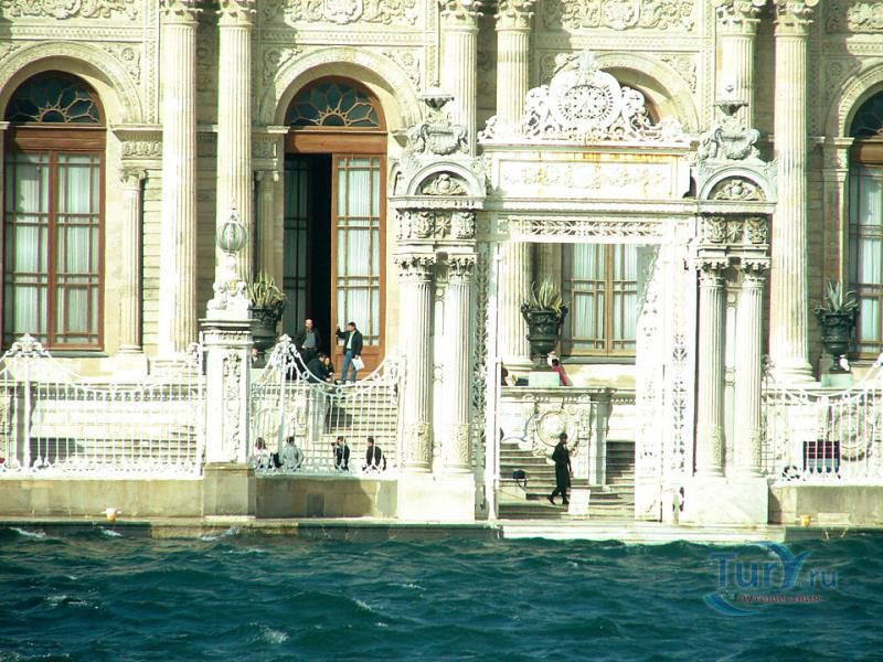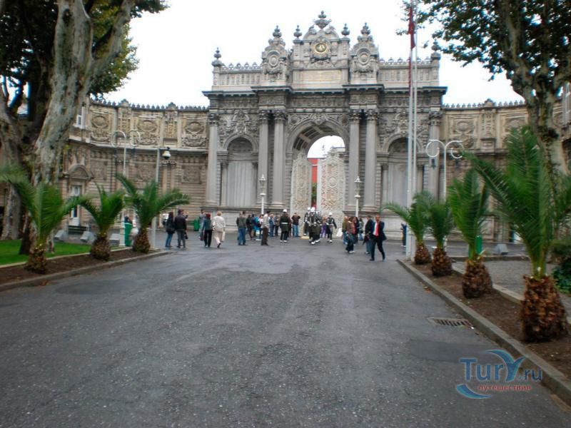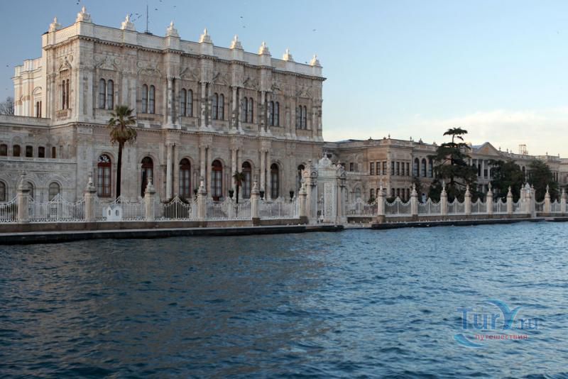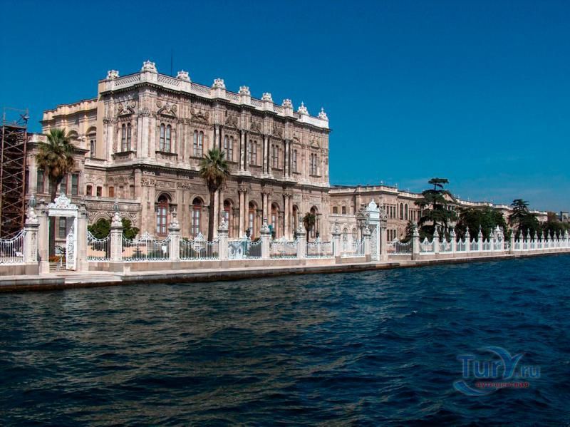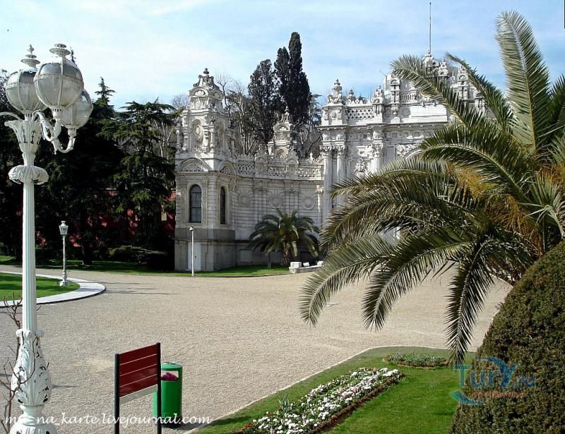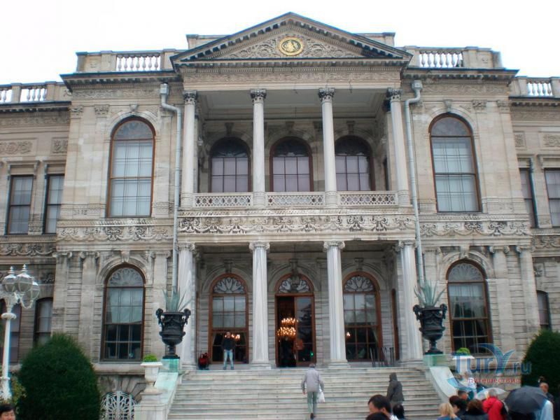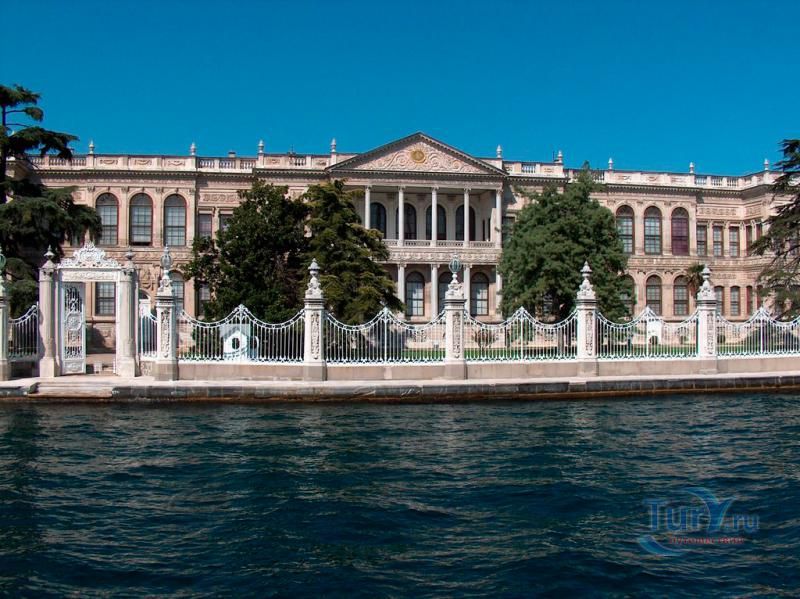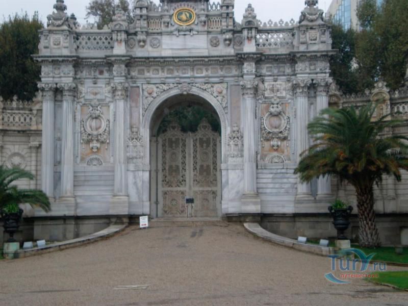 Долмабахче́ - дворец османских султанов в Стамбуле, расположенный в живописном месте на европейском берегу Босфора. Строился дворец с 1842 по 1853 годы. Причина его появления - каприз правителя Турции султана Абдул-Междида I: прогрессивный монарх тяготился громоздким и тяжёлым архитектурным наследием предшественников - дворцовым комплексом Топкапы, и пожелал иметь собственный дворец, способный соперничать в изысканности с европейскими резиденциями XVIII века. Султану этот дерзкий замысел удался с большим успехом - блестящий стиль барокко обрёл на берегах Босфора особый шарм. До XVII века в этом месте был неглубокий залив, где базировался флот. В середине XVII века залив засыпали и организовали прекрасный парк. С тех пор эту местность стали назвать Долмабахче – «насыпной сад». Чуть позже на этом месте появился деревянный прибрежный дворец Бешикташ. В 1843 году деревянный дворец снесли и стали строить огромный дворцовый комплекс. Дворец Долмабахче самый «нетурецкий» дворец в Стамбуле. В качестве архитекторов выступали армяне из семейства Бальянов. Среди основных достопримечательностей - люстра из богемского стекла весом почти в пять тонн, подаренная королевой Викторией, и собрание картин Айвазовского, которые художник исполнил по заказу султана. На украшение Хрустальной лестницы и прочих интерьеров ушло 14 тонн золота, а общая стоимость строительства превысила пять миллионов золотых фунтов. Большой дворец Долмабахче состоит из трёх частей: Государственных апартаментов, Церемониального зала и Гарема. В первых залах султан осуществлял функции главы государства, комнаты гарема предназначались для личной жизни правителя, а Церемониальный зал служил подобием связующего звена между двумя сторонами одной личности. Всего же во дворце 285 комнат и 44 зала приёмов, что красноречиво свидетельствует о размахе Османской империи и замыслов Абдул-Меджида. За несколько десятилетий дворцовый комплекс, первоначально скромный по размерам, разросся до того, что занял 45 тыс. кв. метров. Помимо самого дворца в дворцовом комплексе были построены вспомогательные помещения: мельница, конюшня, птичий двор, кондитерский цех, кухня. Они располагаются через дорогу от дворца, чтобы запах не мешал султану. В 1895 году возвели башню с часами, высота которой 27 метров. Часы на башне идут до сих пор. Частью дворцового комплекса была и мечеть Долмабахче, построенная в стиле барокко. На территорию дворцового комплекса Долмабахче, фасад которого растянулся на 600 метров вдоль моря, ведут 12 ворот. Возле входа в ворота Сокровищ - почетный караул, смена которого происходит каждый час. В числе заслуживающих самого пристального внимания зданий дворцового комплекса Долмабахче - изящный персиковый павильон Айналыкавак с резными наличниками; нереальной красоты сказочные павильоны Ихламур; шале-дворец Йылдыз; павильоны Маслак и Бейкоз, роскошный летний дворец Бейлербей, а также морской особняк Флория Ататюрк и дом Ялова Ататюрк. Церемония открытия дворца была приурочена к окончанию Крымской войны 1856 года. С тех пор дворец Долмабахче стал официальной резиденцией султанов. Всего здесь проживало шесть турецких султанов. После падения монархии и до 1938 года в нем жил и работал основатель Турецкой республики и первый её президент Ататюрк. После его смерти дворец стал музеем вп