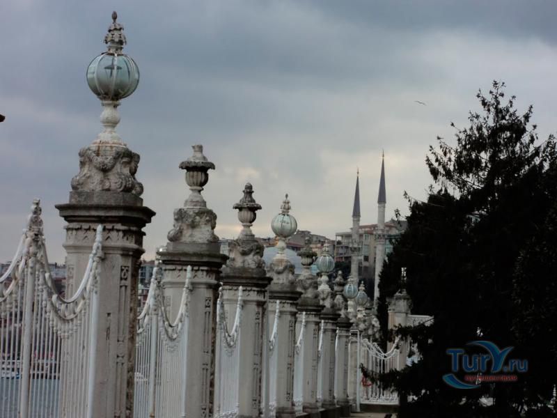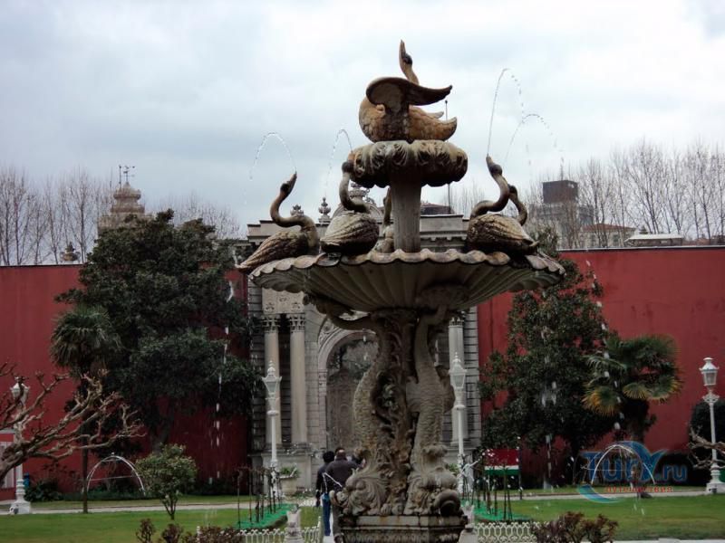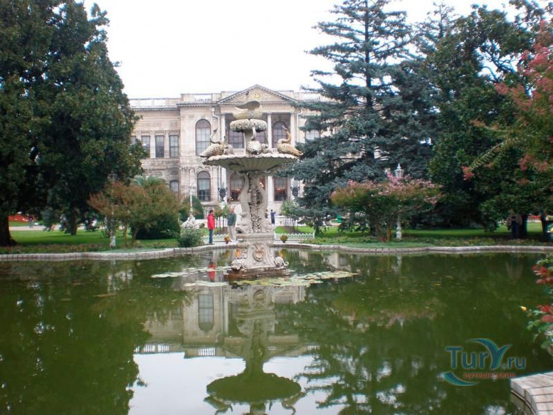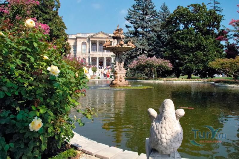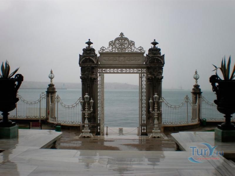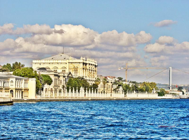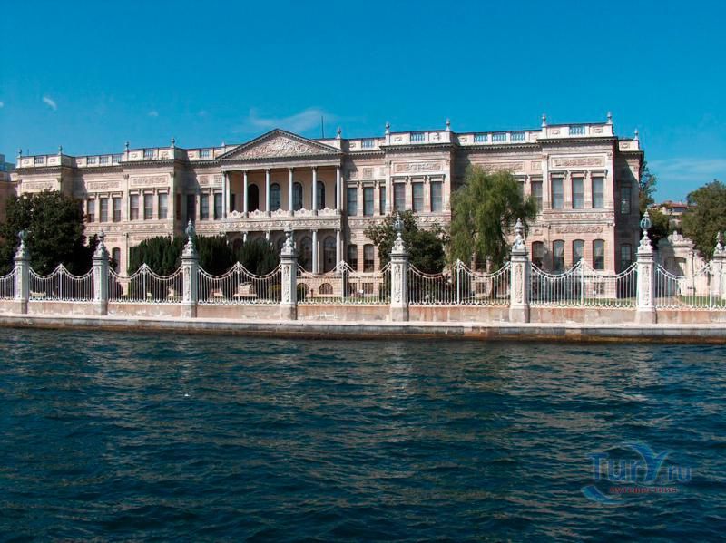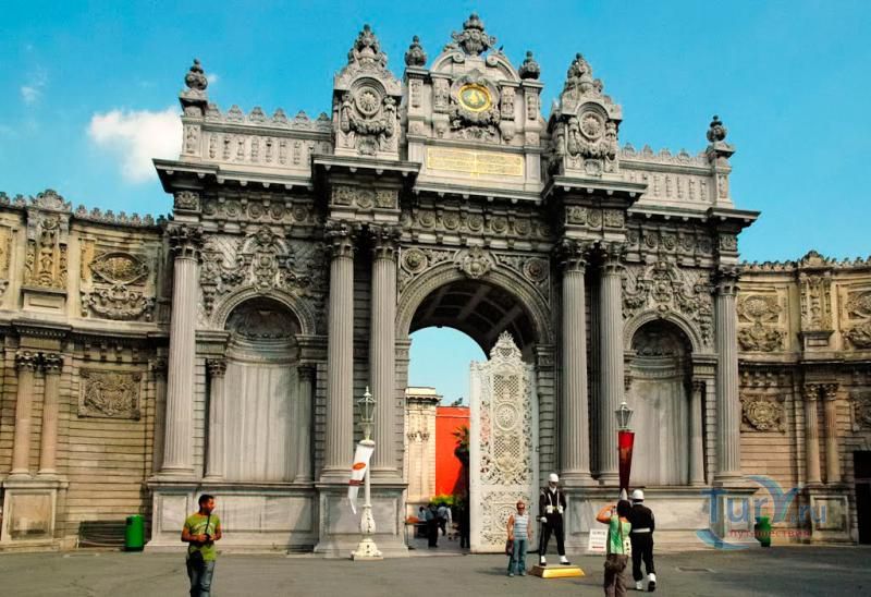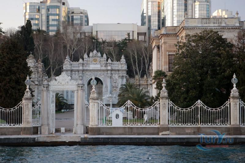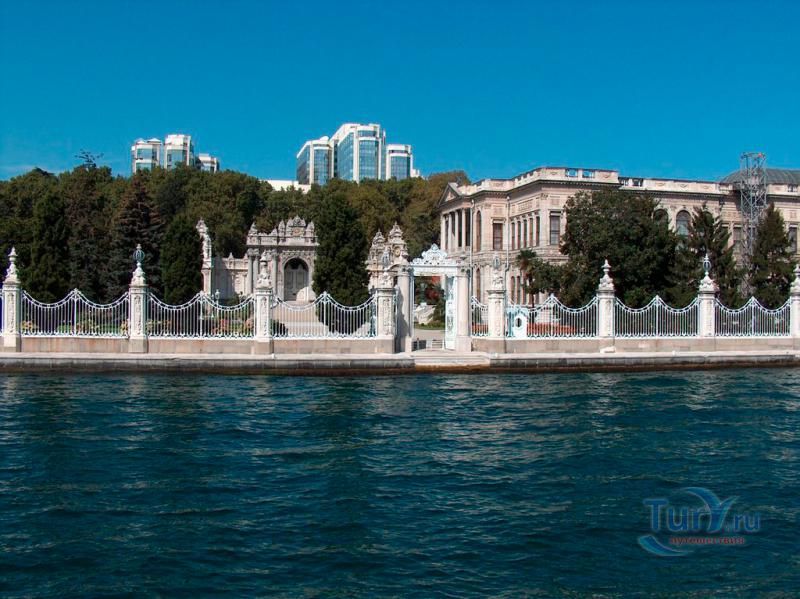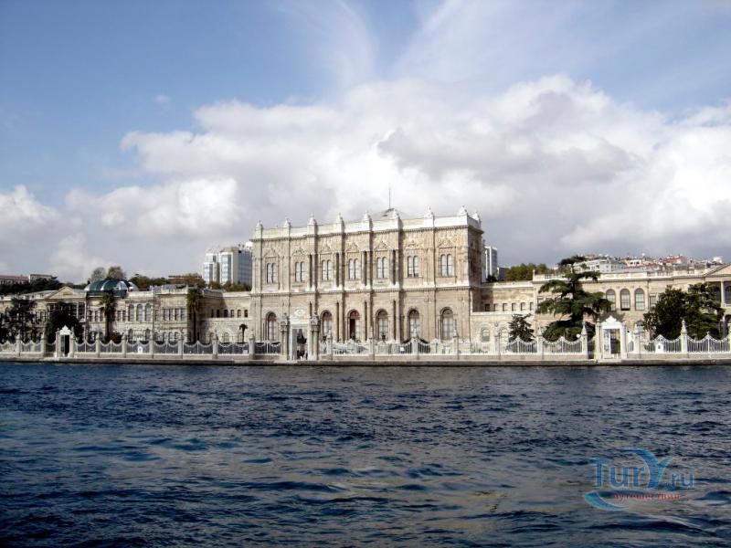 Долмабахче́ - дворец османских султанов в Стамбуле, расположенный в живописном месте на европейском берегу Босфора. Строился дворец с 1842 по 1853 годы. Причина его появления - каприз правителя Турции султана Абдул-Междида I: прогрессивный монарх тяготился громоздким и тяжёлым архитектурным наследием предшественников - дворцовым комплексом Топкапы, и пожелал иметь собственный дворец, способный соперничать в изысканности с европейскими резиденциями XVIII века. Султану этот дерзкий замысел удался с большим успехом - блестящий стиль барокко обрёл на берегах Босфора особый шарм. До XVII века в этом месте был неглубокий залив, где базировался флот. В середине XVII века залив засыпали и организовали прекрасный парк. С тех пор эту местность стали назвать Долмабахче – «насыпной сад». Чуть позже на этом месте появился деревянный прибрежный дворец Бешикташ. В 1843 году деревянный дворец снесли и стали строить огромный дворцовый комплекс. Дворец Долмабахче самый «нетурецкий» дворец в Стамбуле. В качестве архитекторов выступали армяне из семейства Бальянов. Среди основных достопримечательностей - люстра из богемского стекла весом почти в пять тонн, подаренная королевой Викторией, и собрание картин Айвазовского, которые художник исполнил по заказу султана. На украшение Хрустальной лестницы и прочих интерьеров ушло 14 тонн золота, а общая стоимость строительства превысила пять миллионов золотых фунтов. Большой дворец Долмабахче состоит из трёх частей: Государственных апартаментов, Церемониального зала и Гарема. В первых залах султан осуществлял функции главы государства, комнаты гарема предназначались для личной жизни правителя, а Церемониальный зал служил подобием связующего звена между двумя сторонами одной личности. Всего же во дворце 285 комнат и 44 зала приёмов, что красноречиво свидетельствует о размахе Османской империи и замыслов Абдул-Меджида. За несколько десятилетий дворцовый комплекс, первоначально скромный по размерам, разросся до того, что занял 45 тыс. кв. метров. Помимо самого дворца в дворцовом комплексе были построены вспомогательные помещения: мельница, конюшня, птичий двор, кондитерский цех, кухня. Они располагаются через дорогу от дворца, чтобы запах не мешал султану. В 1895 году возвели башню с часами, высота которой 27 метров. Часы на башне идут до сих пор. Частью дворцового комплекса была и мечеть Долмабахче, построенная в стиле барокко. На территорию дворцового комплекса Долмабахче, фасад которого растянулся на 600 метров вдоль моря, ведут 12 ворот. Возле входа в ворота Сокровищ - почетный караул, смена которого происходит каждый час. В числе заслуживающих самого пристального внимания зданий дворцового комплекса Долмабахче - изящный персиковый павильон Айналыкавак с резными наличниками; нереальной красоты сказочные павильоны Ихламур; шале-дворец Йылдыз; павильоны Маслак и Бейкоз, роскошный летний дворец Бейлербей, а также морской особняк Флория Ататюрк и дом Ялова Ататюрк. Церемония открытия дворца была приурочена к окончанию Крымской войны 1856 года. С тех пор дворец Долмабахче стал официальной резиденцией султанов. Всего здесь проживало шесть турецких султанов. После падения монархии и до 1938 года в нем жил и работал основатель Турецкой республики и первый её президент Ататюрк. После его смерти дворец стал музеем вп