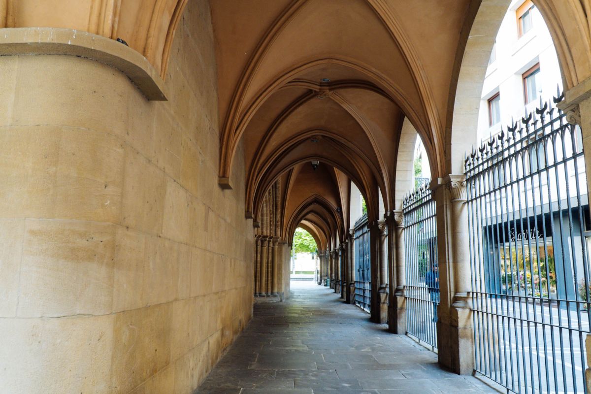Церковь имеет план латинского креста и три нефа; планировка, сводчатые крыши и часть центральной стены относятся к протоготическому типу, а ребристые крыши центрального нефа, перехода и пресвитерия (с его распятием и витражами) относятся к 14 веку. Остальное строительство связано с более поздними реформами.