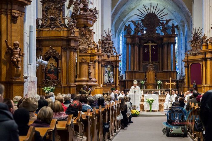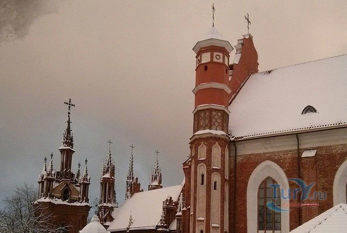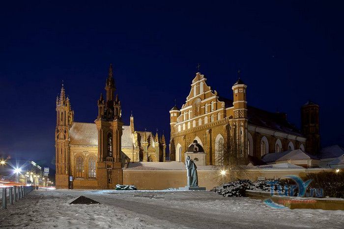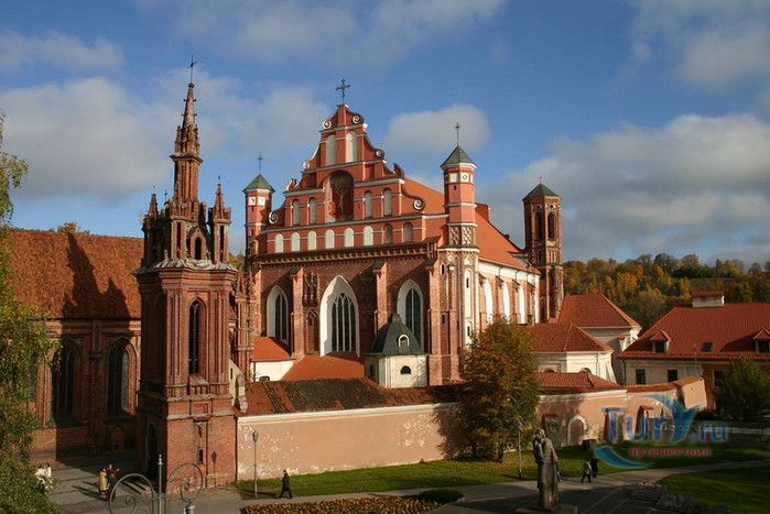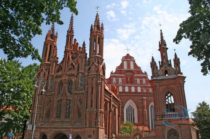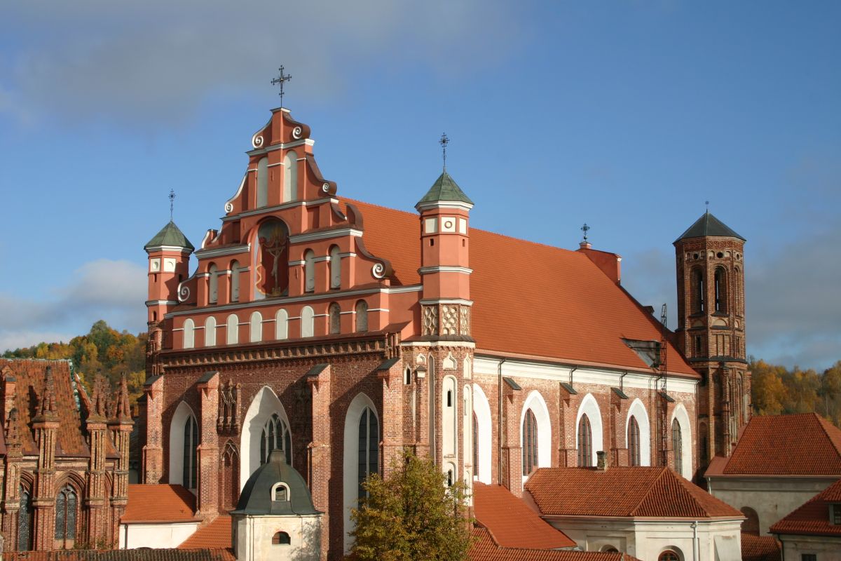 Костёл Святого Франциска Ассизского известен также как Костёл Святых Франциска и Бернардина или Бернардинский костёл, поскольку храм неоднократно разрушался, а затем отстраивался и освящался заново. Костёл был возведен в 1469 году монахами-францисканцами. Для строительства костёла и монастыря Святого Бернарда Сиенского монахам был выделен земельный участок, на котором раньше, согласно легенде, располагалось древнее языческое святилище. Первый храм был деревянным, в 1475 году он полностью сгорел во время пожара. В 1490 году рядом с костёлом Святой Анны был возведён новый каменный костёл. Из-за ошибок в конструкции, вскоре храм стал рушиться, появились трещины в стенах, и он был снесён. Третий по счёту костёл, во имя Франциска Ассизского, был построен в начале XVI века. С 1577 года до середины XVII века на средства Великого князя Литовского Стефана Батория, князя Николая Христофора Радзивилла и горожан Вильно восстанавливалось внутреннее убранство храма, полностью выгоревшее после очередного пожара. Были построены новые алтари и возведены часовни Святого Флориана, Святого Михаила, Петра Алькантрийского, реконструированы готические своды боковых нефов. В костёле был установлен орган, по свидетельствам современников, лучший в Великом княжестве Литовском. Богатый алтарь со скульптурным изображением Распятия был возведён на средства гетмана Яна Кароля Ходкевича и его супруги Софии Мелецкой. Новые потрясения для храма наступили во время военного конфликта 1654-1667 годов. Костёл и монастырь были разграблены, а сам костёл - сожжён. Погибли монахи и многие горожане, укрывавшиеся в монастыре. Восстановление храма финансировал гетман Великого княжества Литовского Михаил Пац, и в 1676 году состоялось освящение костёла во имя святых Франциска Ассизского и Бернардина Сиенского. В костёле был возведен ансамбль из 17 деревянных с позолоченной росписью алтарей, посвящённых страданиям Иисуса Христа, Пресвятой Деве Марии и святым Антонию Падуанскому, Бернардину и Франциску. На фасаде храма была написана фреска с изображённым на ней распятием, был реконструирован орган и перенесен в хоры пресвитерия. При подавлении восстания Тадеуша Костюшко в 1794 году, затем - во время военных действий 1812 года, костёл снова получил значительные разрушения. А в августе 1864 года, после подавления Январского восстания, монастырь упразднили, а Костёл Святых Франциска Ассизского и Бернардина Сиенского стал приходским. Орган был перенесен на балкон над входом костёла. Во второй половине XIX века алтари были украшены картинами и реликвиями из костёла тринитариев, расположенного на Антакальнисе. В 1974 году была построена колокольня в первоначальном архитектурном стиле костёла - готическом. Несмотря на все разрушения и реконструкции, в облике храма сохранился его первоначальный вид - готического храма с укреплёнными контфорсами, башнями и бойницами в северной стене здания. Элементы барокко и ренессанса были добавлены в более поздние периоды. Центральная часть главного фасада украшена стрельчатыми окнами и боковыми нишами с орнаментом. Интерьер костёла имеет 3 нефа одинаковой высоты, центральный - вдвое шире боковых. Неф переходит в более низкий пресвитерий, отделённый триумфальной аркой, и заканчивается гранёной апсидой. Пресвитерий предназначен для монахов, а основн