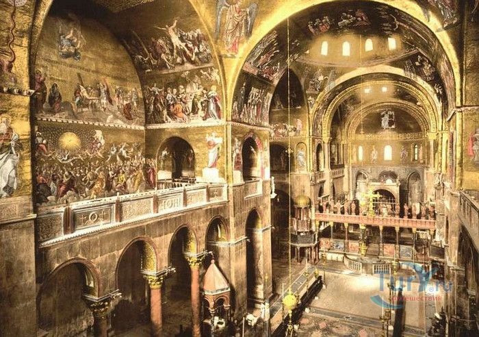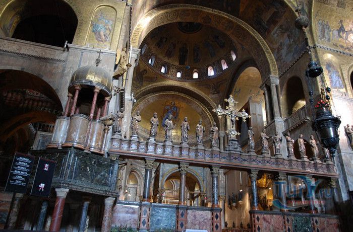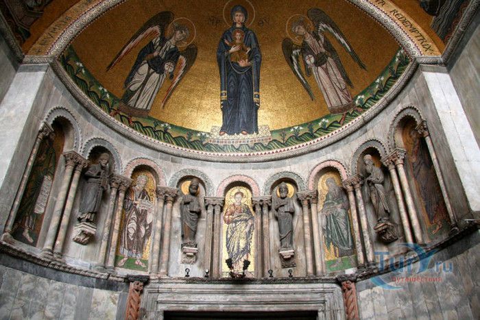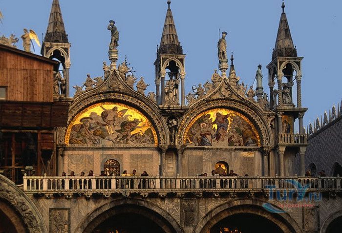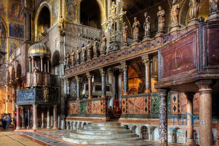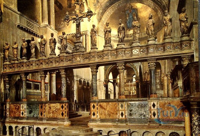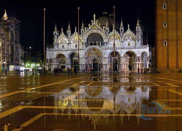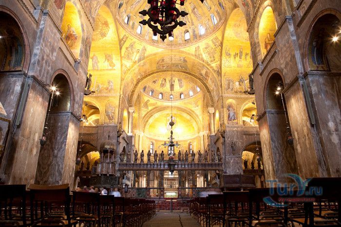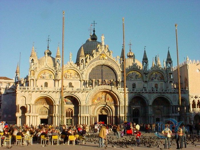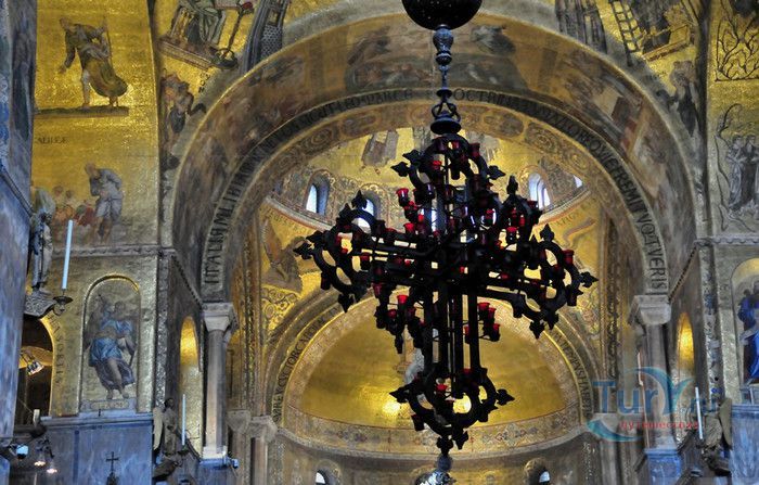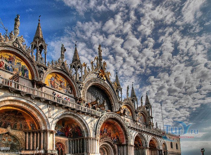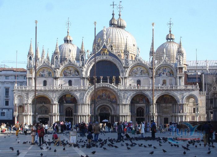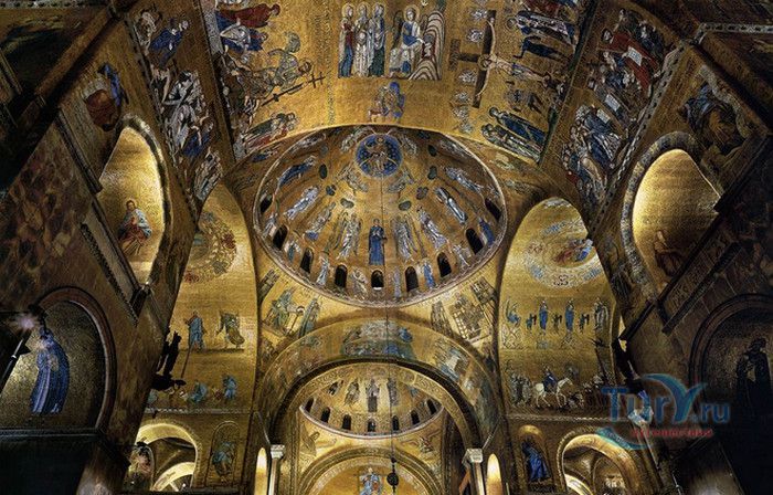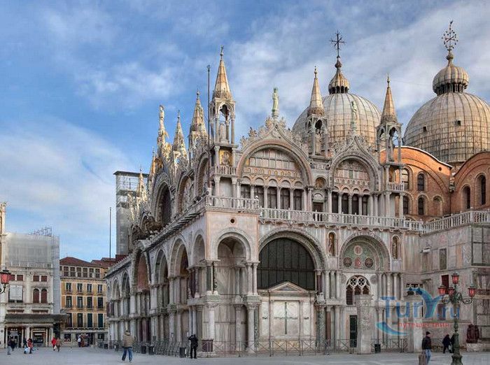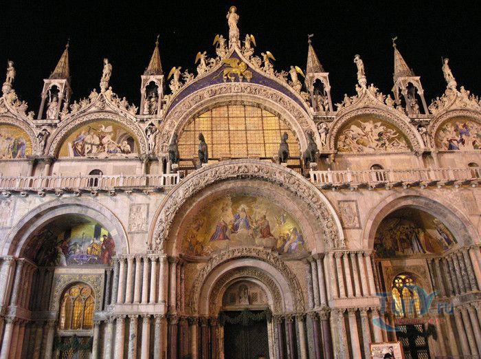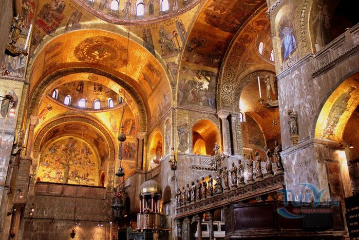 Базилика Сан-Марко - главный собор Венеции, на протяжении столетий являющийся центром общественной и религиозной жизни Венеции. Здесь происходили все важнейшие государственные церемонии: посвящения дожей Венецианской республики, вручение знаков власти венецианским флотоводцам и кондотьерам, общегородские молебны и торжества. История Базилики началась с 31 января 828 года, когда двумя купцами из Александрии в Венецию были привезены мощи Святого Марка. Для размещения мощей рядом с Дворцом дожей была построена Базилика. Небесным покровителем Венеции становится Святой Марк, а символом города - крылатый лев. Первоначальная Базилика сгорела во время пожара 976 года, в 1063 году началось строительство нового храма, которое было завершено в 1071 году, а в 1094 году состоялось его торжественное освящение. В течение последующих столетий Базилика расширялась и украшалась: в 1159 году начались работы по облицовке собора мрамором, в XII веке были выполнены мозаики центральных куполов и сводов, в 1343-1354 годах были пристроены баптистерий и капелла Святого Исидора, в XV веке - капелла Масколо и ризница, в 1504-1521 годах - капелла Дзен. Базилика имеет форму греческого креста с пятью куполами. В собор ведут пять входов, украшенных монументальными резными порталами, часть мраморных рельефов привезена из Византии. Фасады украшены мозаикой, резьбой по дереву, скульптурами и барельефами. Над главным входом в храм возвышается бронзовая квадрига - четвёрка несущихся вскачь лошадей. В настоящее время на фасаде установлена точная копия, а оригинал из позолоченной бронзы и серебра хранится в музее Сан-Марко. Интерьер Базилики поражает своим величием и богатством. Купола, арки и верхний уровень стен собора украшают мозаичные полотна, которые на протяжении четырёх веков создавались византийскими и венецианскими мастерами. Пол храма выложен разноцветными мраморными плитками. Над алтарной преградой возвышается массивное бронзовое распятие, украшенное серебром, созданное венецианским мастером Джакопо ди Марко Беннато. В алтарной части Базилики находится одна из главных святынь Венеции - Pala d'Oro (Золотой алтарь). Он был привезен в Венецию из Константинополя и хранится в Базилике Сан-Марко. В центре алтаря находится фигура Христа, возвещающего миру: «Аз есмь Свет». Створки алтаря украшают медальоны с эмалевыми изображениями императоров и святых. Алтарь украшен золотом, серебром и 1927 драгоценными камнями, в том числе изумрудами, сапфирами и рубинами. Алтарь собора Сан-Марко отличают роскошь, великолепие, тонкость ювелирной работы и значительность образов Христа и евангелистов. Слева от главного алтаря находится алтарь с иконой Мадонна Никопея, написанной в X веке. В капелле Святого Исидора находится мраморная гробница, в которой погребен Святой Исидор, в Баптистерии похоронен дож Андреа Дандоло - один из самых выдающихся деятелей Венеции, друг Петрарки. Своды баптистерия покрывает сплошной ковер мозаик, а в центре расположена мраморная купель, созданная в начале XVI века скульптором Джакопо Сансовино. Музей Сан-Марко основан в конце XIX века по инициативе Пьетро Саккардо. В нём представлены фрагменты ранних мозаик Базилики, размещена экспозиция драгоценных тканей, икон и старинных хоралов. Сокровищница Базилики Сан-Марко уцелела до наших дней, в ней хранится част
