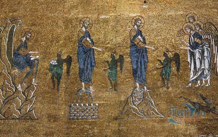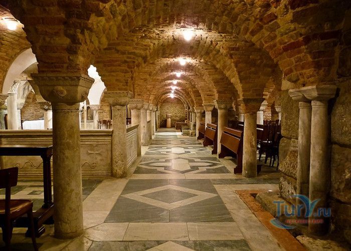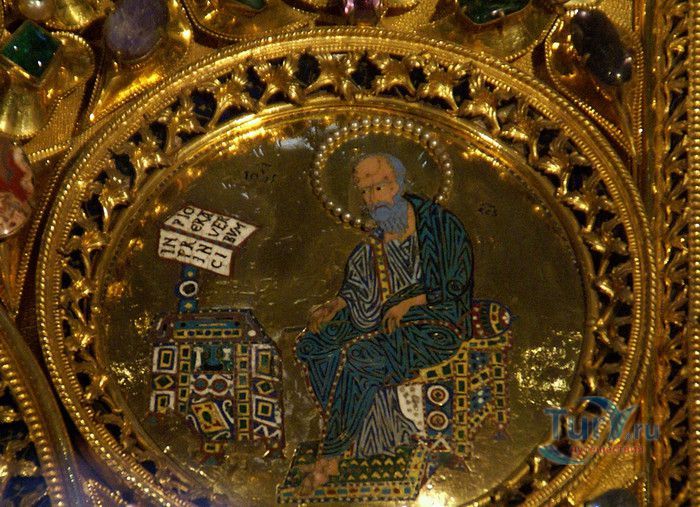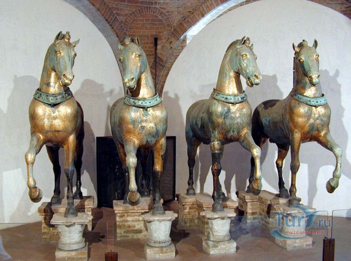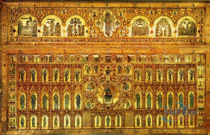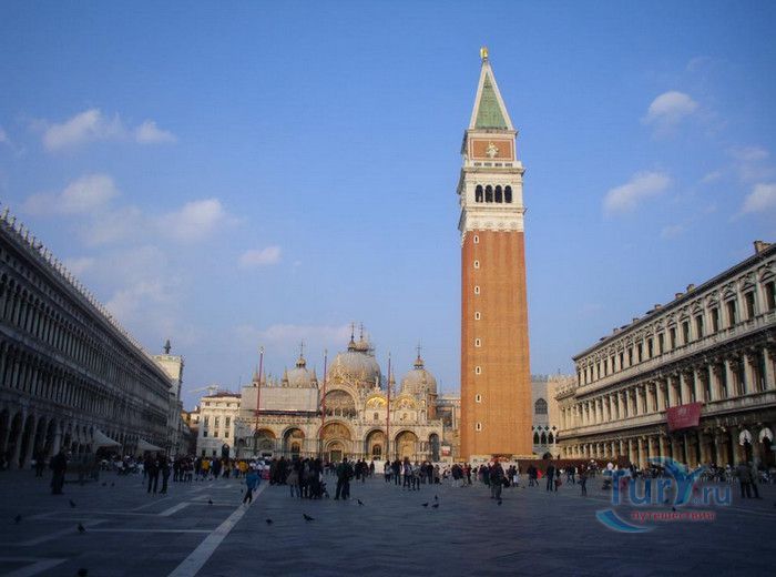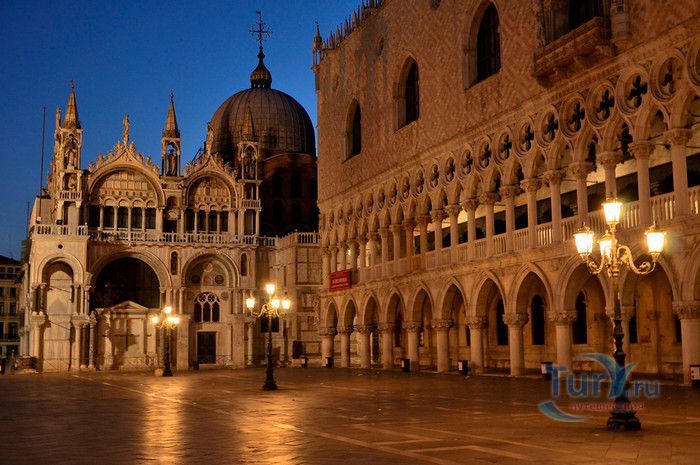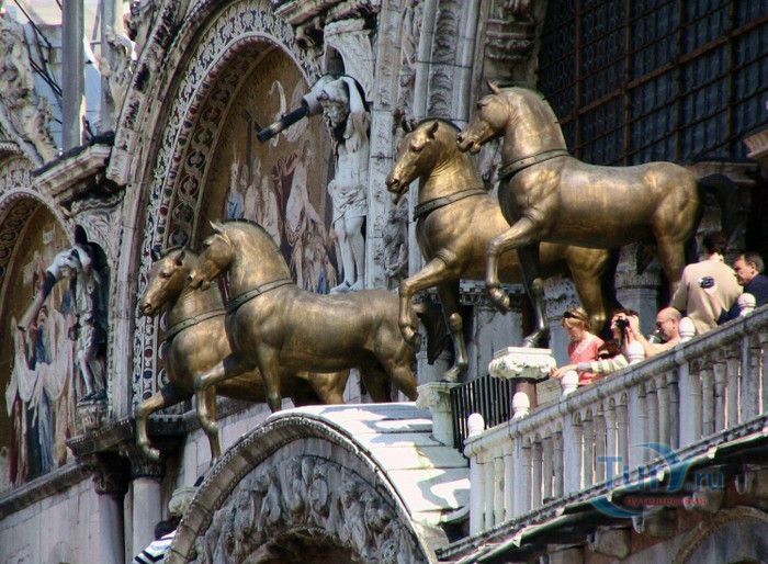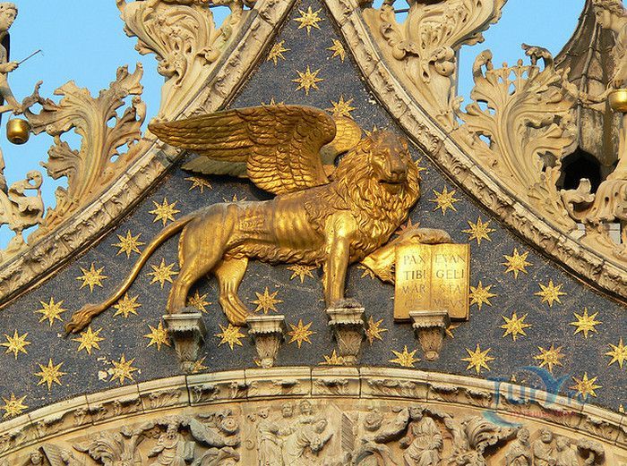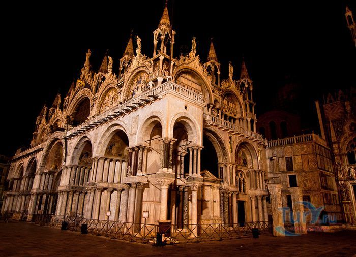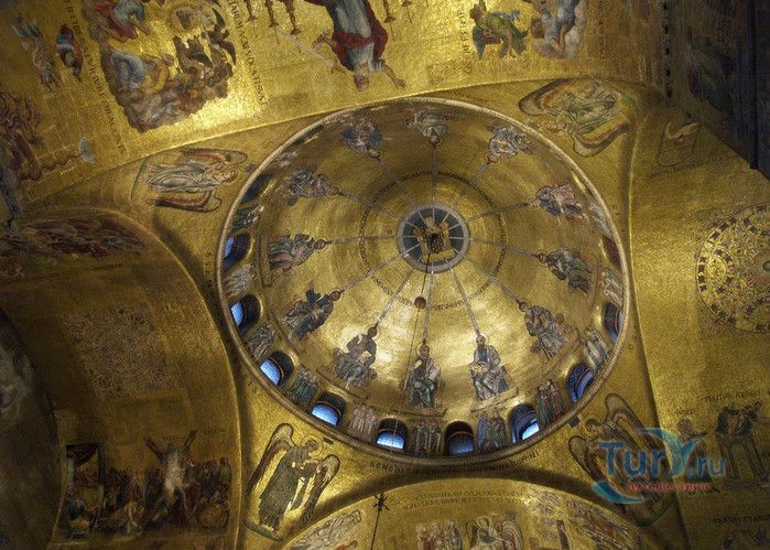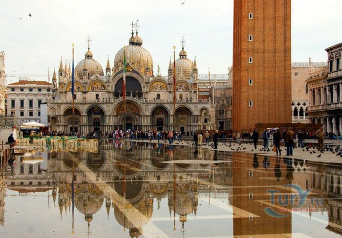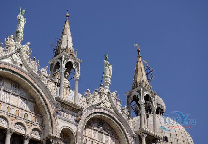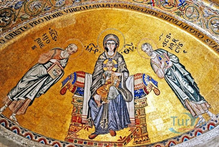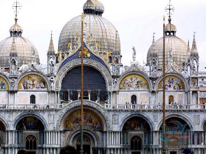 Базилика Сан-Марко - главный собор Венеции, на протяжении столетий являющийся центром общественной и религиозной жизни Венеции. Здесь происходили все важнейшие государственные церемонии: посвящения дожей Венецианской республики, вручение знаков власти венецианским флотоводцам и кондотьерам, общегородские молебны и торжества. История Базилики началась с 31 января 828 года, когда двумя купцами из Александрии в Венецию были привезены мощи Святого Марка. Для размещения мощей рядом с Дворцом дожей была построена Базилика. Небесным покровителем Венеции становится Святой Марк, а символом города - крылатый лев. Первоначальная Базилика сгорела во время пожара 976 года, в 1063 году началось строительство нового храма, которое было завершено в 1071 году, а в 1094 году состоялось его торжественное освящение. В течение последующих столетий Базилика расширялась и украшалась: в 1159 году начались работы по облицовке собора мрамором, в XII веке были выполнены мозаики центральных куполов и сводов, в 1343-1354 годах были пристроены баптистерий и капелла Святого Исидора, в XV веке - капелла Масколо и ризница, в 1504-1521 годах - капелла Дзен. Базилика имеет форму греческого креста с пятью куполами. В собор ведут пять входов, украшенных монументальными резными порталами, часть мраморных рельефов привезена из Византии. Фасады украшены мозаикой, резьбой по дереву, скульптурами и барельефами. Над главным входом в храм возвышается бронзовая квадрига - четвёрка несущихся вскачь лошадей. В настоящее время на фасаде установлена точная копия, а оригинал из позолоченной бронзы и серебра хранится в музее Сан-Марко. Интерьер Базилики поражает своим величием и богатством. Купола, арки и верхний уровень стен собора украшают мозаичные полотна, которые на протяжении четырёх веков создавались византийскими и венецианскими мастерами. Пол храма выложен разноцветными мраморными плитками. Над алтарной преградой возвышается массивное бронзовое распятие, украшенное серебром, созданное венецианским мастером Джакопо ди Марко Беннато. В алтарной части Базилики находится одна из главных святынь Венеции - Pala d'Oro (Золотой алтарь). Он был привезен в Венецию из Константинополя и хранится в Базилике Сан-Марко. В центре алтаря находится фигура Христа, возвещающего миру: «Аз есмь Свет». Створки алтаря украшают медальоны с эмалевыми изображениями императоров и святых. Алтарь украшен золотом, серебром и 1927 драгоценными камнями, в том числе изумрудами, сапфирами и рубинами. Алтарь собора Сан-Марко отличают роскошь, великолепие, тонкость ювелирной работы и значительность образов Христа и евангелистов. Слева от главного алтаря находится алтарь с иконой Мадонна Никопея, написанной в X веке. В капелле Святого Исидора находится мраморная гробница, в которой погребен Святой Исидор, в Баптистерии похоронен дож Андреа Дандоло - один из самых выдающихся деятелей Венеции, друг Петрарки. Своды баптистерия покрывает сплошной ковер мозаик, а в центре расположена мраморная купель, созданная в начале XVI века скульптором Джакопо Сансовино. Музей Сан-Марко основан в конце XIX века по инициативе Пьетро Саккардо. В нём представлены фрагменты ранних мозаик Базилики, размещена экспозиция драгоценных тканей, икон и старинных хоралов. Сокровищница Базилики Сан-Марко уцелела до наших дней, в ней хранится част