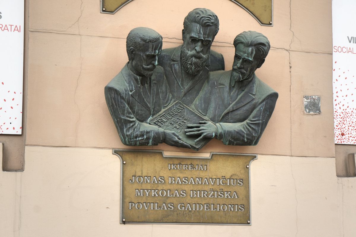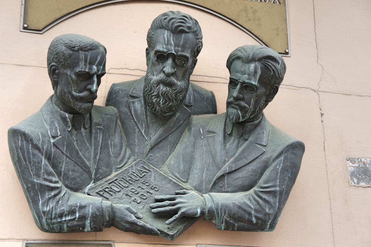 Sculpture for memorise founders of Lithuanian gymnasium: Jonas Basanavicius, Mykolas Birziska, Povilas Gaidelionis.
