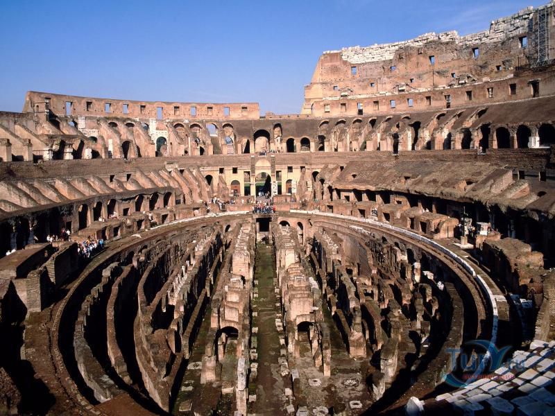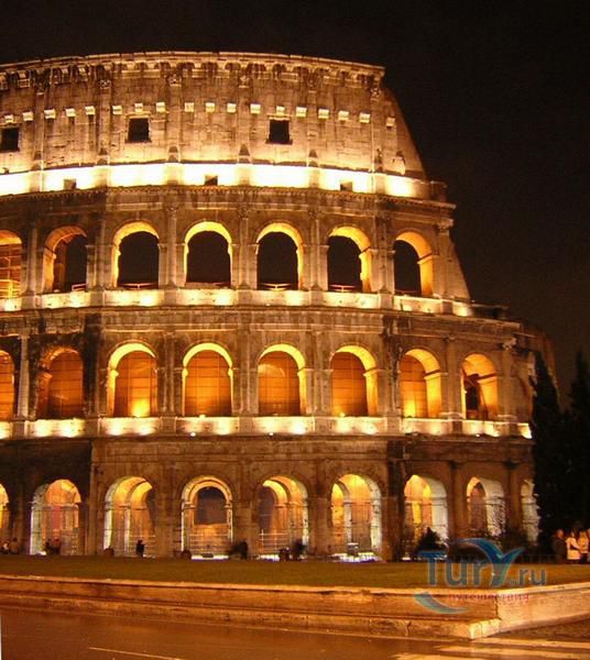 Самая знаменитая достопримечательность Италии - хорошо сохранившийся Римский амфитеатр — Колизей, считающийся крупнейшим подобным сооружением за пределами Италии (входил в пятерку самых крупных построек Римской империи). Амфитеатр - римское изобретение. Он состоял из арены эллиптической формы, окруженный выстроенными ярусами рядов сидячих трибун, находясь на которых, многочисленная публика, не подвергая себя риску, могла наблюдать захватывающие кровопролитные зрелища. Здесь проводились бои гладиаторов и выводили напоказ экзотических диких зверей, чтобы потом на глазах завороженной толпы стравить их друг с другом в смертельной схватке. Он был рассчитан на 23 000 чел. Строительство массивного и величественного Колизея началось императором Веспасиана из рода Флавиев в 72 г. н.э. Он был открыт через восемь лет с программой игр и представлений, длящихся 100 дней. Гладиаторские бои здесь прекратились в 6-ом веке. Колизей впоследствии служил римлянам каменоломней, из мраморных плит и других материалов которого строились церкви и дворцы эпохи Возрождения. В руины Колизей стал превращаться VIII веке (гладиаторские бои к тому времени здесь не проводились уже около 4 столетий), когда один кардинал, племянник Папы, использовал камень Колизея для постройки собственного дворца. К счастью, Павел III ограничил деятельность племянника по разбору памятника Античности на стройматериалы 12 часами. Папы эпохи Возрождения были менее милостивы к Колизею. Лишь в XVIII столетии его стали охранять и сохранять. Современные власти Италии проводят в амфитеатре масштабные реставрационные работы, мечтая со временем превратить его в театральную сцену. Благодаря столь богатой технической оснащенности и четкой организации размещения зрителей, Колизей приобрел славу архитектурного соорркения, намного опередившего свою эпоху. Конструктивные принципы его постройки поражают и поныне.