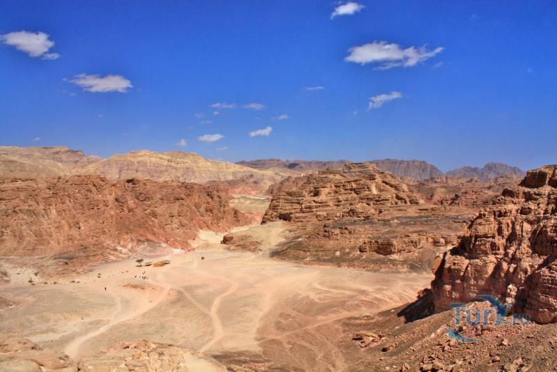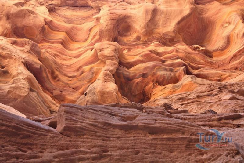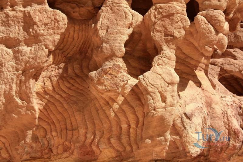 Цветной Каньон - очень необычное, интересное и увлекательное место, которое находится на Синайском полуострове. Его название говорит само за себя. Благодаря примесям оксида железа и марганца скалы каньона имеют самую живую раскраску: белую, желтую, розовую, зеленую, оранжевую, бордовую, красную, фиолетовую. Окраска скал в некоторых местах очень яркая с призматическим металлическим блеском; в других местах цвет камня очень мягкий и нежный. Сложно поверить, что миллионы лет назад на этом участке Синайских гор было море. Природная катастрофа внесла свои коррективы, огромное землетрясение подняло морское дно, соорудив таким образом одно из самых красивейших мест на Земле. В течение нескольких столетий вода, солнце и ветер вытачивали в красном песчанике углубления. Дно бывшего моря обрело вид замысловатого лабиринта, и человеческому взору предстал огромнейший каньон из красного складчатого песка. Во время дождей (дожди бывают в среднем 4 раза в год) каньон, обычно пересыхающий в течение года, затопляется водой. После сильных дождей 2002 года некоторые скалы в ущелье сместились и стали неустойчивы. Свой след оставили в ущелье и пустынные ветры, вырезав в цветных скалах самые затейливые узоры. В некоторых местах Цветного каньона можно увидеть особенно примечательные сюжеты, с которыми связано немало историй и легенд. Это отпечатки кораллов, след динозавра, приносящие удачу «глаза» каньона и «трон» Клеопатры. Рисунки на скалах будоражат воображение – здесь можно найти человеческие лица, сказочных животных и птиц, лики божества или еще что-то, что подскажет ваша фантазия. В каньоне можно встретить удивительное растение - уникальное вьющееся дерево, которое обладает целительной силой. Оно умеют влиять на самочувствие людей положительными флюидами. Цветной каньон не только восхитителен и необычен, он еще и тяжел в покорении: тесные щели, через которые нелегко пролезть, невыносимо палящее солнце, спутанные лабиринты путей. Всё это - проверка силы духа. Протяженность этого самородного ущелья - 5 километров. Высота скал 20-80 метров, проход между ними 1-10 метров. Любой изгиб Цветного каньона готовит путешественнику сюрприз.
