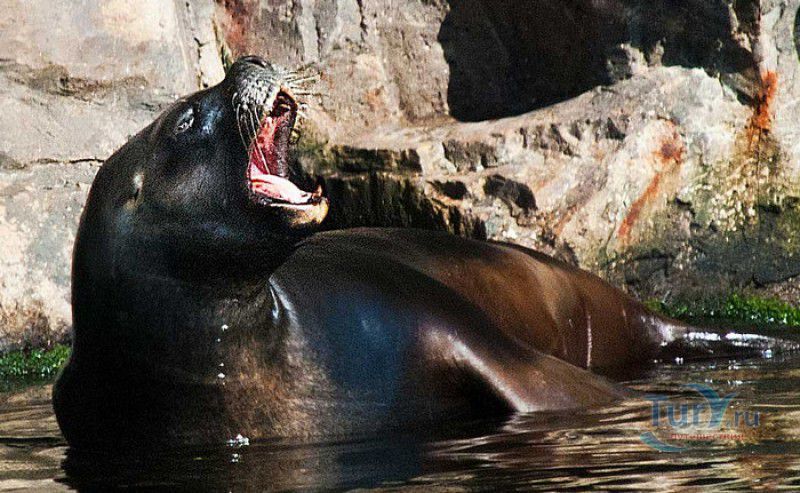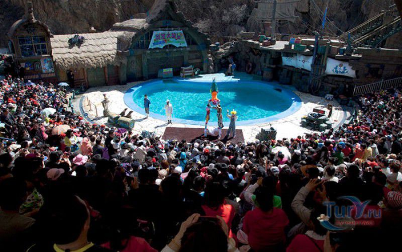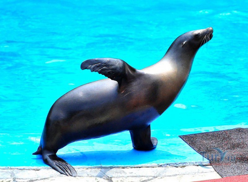 Весёлый театр - это открытый манеж, на котором проходят выступления животных - моржей, морских львов и котиков. Дрессированные животные участвуют в акробатических номерах, танцуют и даже выступают в роли клоунов.