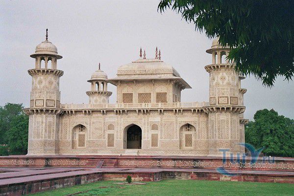Усыпальница Итемад-уд-Даулы стоит в центре персидского парка, поражая изяществом линий и тщательностью отделки. Эту гробницу Нурджахан, любимая супруга Джахангира, построила для своего отца Итемад-уд-Даулы. Она много сделала для своего отца еще при жизни: благодаря дочери он получил пост старшего камергера, а затем первого министра при императоре. В этой гробнице покоятся также останки матери императрицы. Небольшая по размеру гробница на подступах к Тадж-Махалу была построена в 1622 - 1628 гг. и замечательно отражает вкус и ум одаренной императрицы. Это квадратное здание с четырьмя башнями по углам, увенчанное павильоном в форме балдахина; полы инкрустированы арабесками. Теплые тона желтого мрамора контрастируют с белыми и черными узорами, а ажурные мраморные панели и богатая мозаика из самоцветов по-женски нежны и восхитительны.