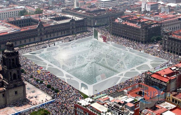 Площадь Конституции имеет неофициальное название - Площадь Сокало, что в переводе с испанского означает плинтус. Площадь, ещё до завоевания испанцами Мексики, была главным церемониальным местом города ацтеков Теночтитлан. После падения Теночтитлана испанцы оказались в разрушенном до основания городе. Перестройка его происходила в европейском стиле, который предполагал прямые узкие улицы и кварталы прямоугольной формы. По приказу наместника Новой Испании Эрнана Кортеса центральная площадь была восстановлена к 1524 году, для её строительства использовались камни из разрушенного святилища ацтеков Теокалли. На площади были возведены собор и дворец вице-короля. На ней устраивались корриды, функционировал рынок, проводилась церемония принятия присяги вице-королей, проходили военные парады и религиозные празднования. В последующие годы площадь и здания, расположенные на ней, неоднократно перестраивались. Сама площадь несколько раз сменяла названия: Пласа Майор, Пласа-де-Армас и Пласа-дель-Паласио. После обретения Мексикой независимости главная площадь столицы стала называться Пласа де ла Конститусьон. На ней планировалось установить монумент Независимости, однако планы не осуществились. Был построен только постамент (сокало), который простоял на площади много лет, дав ей неофициальное название площадь Сокало. В настоящее время главная площадь - исторический центр Мехико занимает целый городской квартал и является одной из самых больших площадей в мире. На ней расположены главные достопримечательности столицы - Национальный дворец и Кафедральный собор. На площади проводятся военные парады, гражданские и культурные мероприятия, проходят концерты и выставки. Ежегодно 15 сентября, в канун провозглашения независимости Мексики, с центрального балкона Национального дворца перед народом, собравшимся на площади, выступает президент страны с торжественной речью.