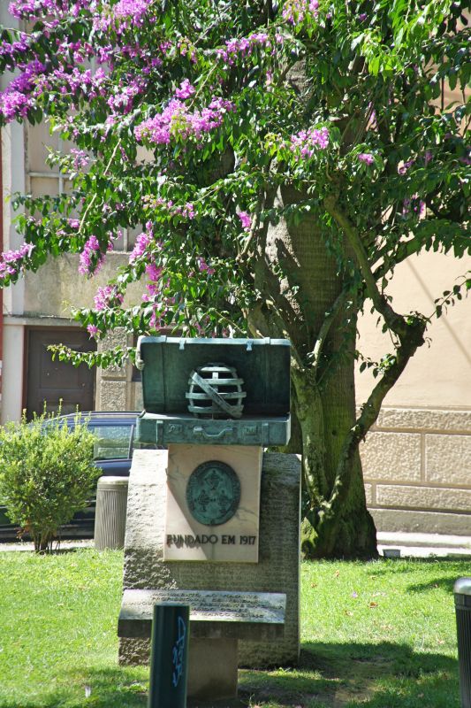 Небольшой деревянный садик практически полностью покрыт зеленым газоном. Там мы можем увидеть памятник молодому специалисту по продажам.