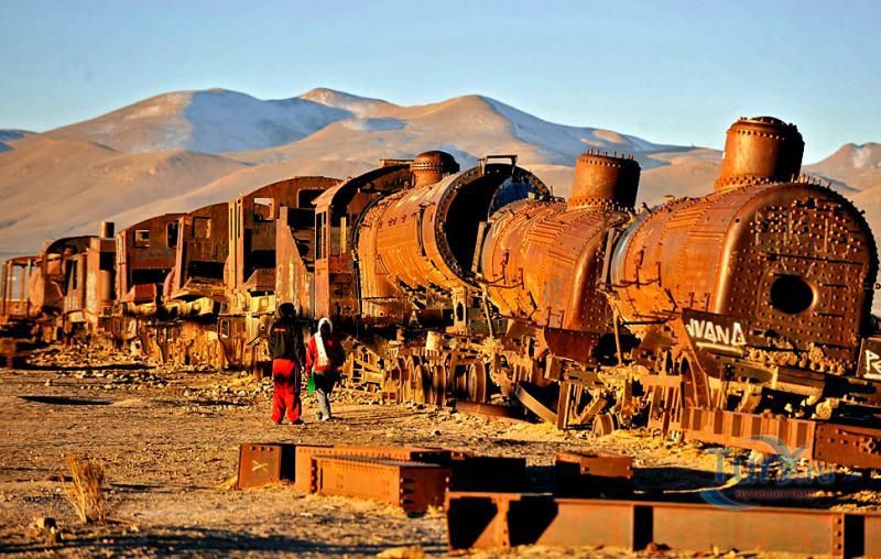 Кладбище паровозов находится всего в трех километрах от вполне современного и цивилизованного города Уюни, затаившегося в горах на высоте более чем в три тысячи семьсот метров над уровнем моря, на юго-западе Боливии. Это место удивляет гостей одним из самых причудливых пейзажей нашей планеты. Широкие открытые пространства, глубокое синее небо и облака, которые движутся быстрее, чем дикие лошади; постоянно сменяющиеся цвета и контрасты. И в самом центре этой красоты скопление ржавых локомотивов и вагонов, многим из которых уже более ста лет. Вид разлагающихся поездов, которые уже давно не ездят, не издают гудков, а только грустно стоят посреди пустыни и постепенно разрушаются, вызывает настоящие мурашки по коже. Поэтому неудивительно, что это место как магнитом притягивает туристов. Видимо, кладбище поездов прекрасно передает атмосферу нашей беспомощности перед временем, ведь даже такие железные «монстры» не могут устоять перед погодой и течением десятилетий. История кладбища поездов началась довольно банально. В конце XIX века правительство Боливии, возглавляемое президентом Анисето Арку, активно поддерживало строительство железнодорожных сетей в этом регионе. Справедливо считая, что для экономического процветания Боливии разветвленная транспортная система железных дорог просто необходима, власти обеспечили финансирование проекта, и вскоре Уюни стал настоящим городом железнодорожников. Здесь была крупная узловая станция, через которую проходили все важные транспортные магистрали региона. По прогнозам, Уюни должен был стать процветающим городом, ключевым транспортным и торговым центром региона. Первой проблемой стал саботаж. Местные индейцы аймары посчитали строительство железной дороги вторжением в их земли и, естественно, стали протестовать. Но если этот вопрос удалось урегулировать, то вот от следующего удара все планы правительства рухнули, как карточный домик. Уюни был важным горнодобывающим центром, вокруг которого располагалось великое множество рудников, приносящих колоссальную прибыль. Поэтому их ресурсы эксплуатировались на полную мощность. В сороковых годах XX они истощились и транспортировать стало больше нечего. Потребность в железнодорожных ветках отпала, а Уюни постепенно пришел в упадок. Ненужными стали и паровозы с вагонами. Кроме того, их обслуживание стоило очень дорого, а дохода они не приносили. Поэтому локомотивы и вагоны стали цениться даже меньше металлолома, ведь слишком много труда и других затрат бы потребовалось, чтобы разобрать их и вывезти из пустыни. В конечном итоге, сослужившую свою службу железнодорожную технику просто бросали под открытым небом за ненадобностью, согнав составы в дальний тупик железнодорожной линии. Горнодобывающая промышленность Боливии в этом регионе рухнула примерно в 1940-х годах, тогда же здесь и начали скапливаться поезда. На кладбище возможно увидеть как останки отдельных частей паровозов, так и целые составы: локомотивы, с прицепленными к ним вагонами. Интересно, что большинство гниющих поездов - это главным образом импорт из Великобритании, которая контролировала развитие железнодорожной системы Боливии. Казалось бы, эти железные «монстры» должны стоять тут столетиями, тем более, что Уюни находится в пустыне, где выпадает очень малое количес