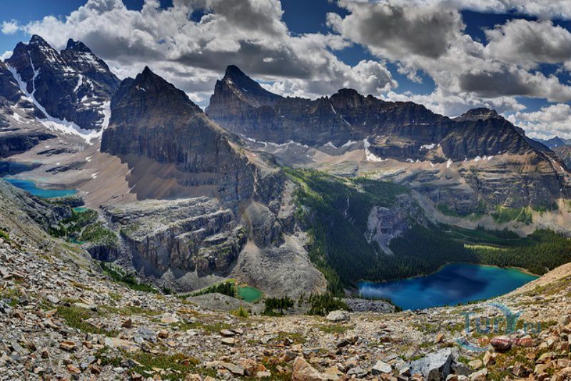 Парк расположен в гористой местности с большим перепадом высот, от ледников на вершинах гор (Гудсир, Стефен, Президент, Вице-Президент, Бургесс) до многочисленных озёр (Эмералд, О\'Хара и др.), водопадов (в том числе второго по высоте в Канаде водопада Такаккау) в долинах, а также с каньонами и известняковыми пещерами. Часто встречаются окаменелости.
