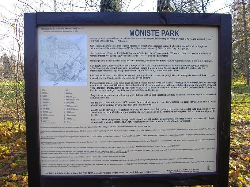 Парк Мынисте площадью 14,6 га был разбит в 1840-х годах. Он является одним из древнейших в Вырумаа. Значительную часть в его оформлении играет запрудное озеро Мынисте. На месте прежнего главного здания усадьбы теперь лежит просторный луг. Из вековых деревьев здесь можно увидеть ели, дубы, липы, бородавчатые березы и лиственницы. Представителями редких видов являются европейский бересклет, маньчжурский орех, зеленая лжетсуга и пр.