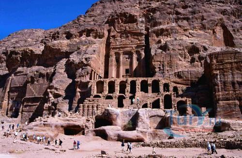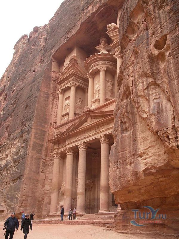 Более 2-х тысяч лет назад Петра была лишь местом временного пристанища кочевых арабов — набатейцев, выходцев с севера Аравийского полуострова. Начавшаяся с нескольких легко обороняемых пещер в скалах Петра постепенно была превращена набатейцами в неприступный город-крепость. Петра до сих пор составляет часть владений бедуинов. Они встречают посетителей со своими лошадьми и верблюдами, чтобы сделать экскурсию в красно-розовый город поистине незабываемой. Чтобы попасть в город, необходимо пешком, верхом на лошади или на фаэтоне пробраться сквозь страшноватое ущелье Сик — глубокий развал в громаде нубийского песчаника; Это петляющий длиной в километр узкий проход между нависающими скалами, почти смыкающимися на высоте более 90 метров. В конце пути ущелье Сик изящно делает последний изгиб, и из полумрака во всем своем великолепии возникает наиболее впечатляющий дворец — эль-Хазне (Казна). Этот величественный памятник древности вырублен в цельной скале и имеет высоту около 42 м и ширину 30 м. Продвигаясь от эль-Хазне к центру города, туристы идут в окружении сотен высеченных в скалах построек, величественных храмов, царских гробниц, маленьких и крупных жилых построек, усыпальниц и праздничных залов, водных каналов и резервуаров, бань, убегающих вверх лестниц, культовых сооружений, торговых лавок, арок, общественных зданий и мощеных улиц. На их пути встречается вырубленный из камня римский амфитеатр, способный вместить 3 тысячи зрителей. Однако Петра — это не только набатейцы. Всего в 15 минутах езды от города расположены руины городищ библейского народа эдомитов, обширные развалины крепости римских легионеров в Узрахе, поселения каменного века в Бейде и Басте, датируемые 7-м тысячелетием до н. э.