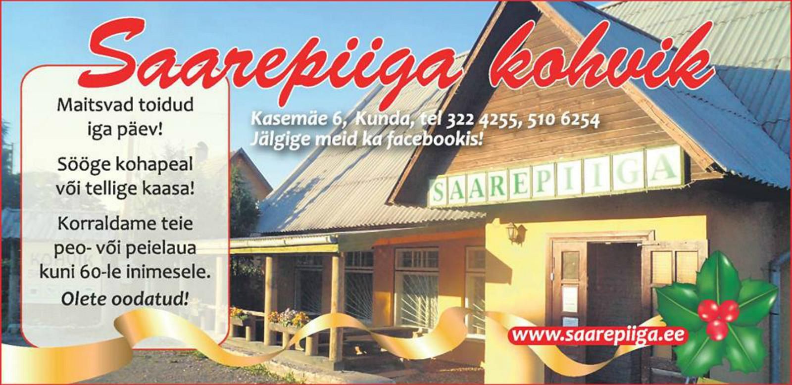Кафе "Saarepiiga" находится в приморском городе Кунда. Кафе "Saarepiiga" предлагает вкусные блюда и напитки. Время от времени проводятся танцевальные вечера с живой музыкой. Кафе "Saarepiiga" приглашает Вас покушать и приятно провести свободное время.
