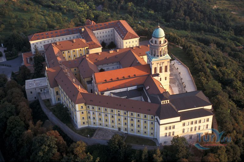 Бенедиктинское аббатство Паннонхалма считается одним из самых древних монастырей Венгрии. Первые монахи прибыли в Паннонхалму в 996 году по призыву князя Гёзы. В 1001 году они освятили небольшую церковь на вершине горы. Расположено аббатство в 20 километрах к юго-востоку от города Дьёр, на вершине холма святого Мартина, высота которого составляет 282 метра. Именно здесь родился венгерский святой Мартин (Мартон) Турский в IV веке. Дом святого находился у подножия холма, который впоследствии и был назван в его честь. Мартин Турский прославился своей святостью и милосердием по отношению к нищим и обездоленным. Одна из легенд рассказывает о том, как Мартин отрубил половину своего плаща и отдал его нищему, чтобы тот мог согреться. Этот эпизод попал и на фрески в самом аббатстве отражающие жизнеописание Святого Мартона. Герб аббатства Паннонхалмы плавными линиями разделен на четыре поля. На левом желтеет кисть винограда. Виноградарство и виноделие - традиционное занятие монахов Паннонхальмы. И не смотря на то, что в коммунистический период виноделие не велось, так как виноградники монастыря были национализированы, вековые традиции не были утеряны. После падения коммунизма и возвращения виноградников монастырю производство было возобновлено. Площадь виноградников составляет 37 гектаров, а винодельческий завод занимает площадь 2000 м2. Более того, осенью для туристов устраиваются зрелищные дегустации. Традиционные для Паннонхалмы сорта вин — райн рислинг, совиньон блан, гевюрцтраминер, вельшрислинг, эзерьо и сарфехер. В двадцатом столетии монахи начали изготавливать и более интернациональные сорта: шардоне, пино блан, пино нуар, мерло и каберне франк. На правом поле герба расположена рукописная книга, старинный фолиант. Монахи аббатства традиционно занимались переписыванием книг. Монастырская библиотека является крупнейшим не государственным книжным собранием страны. Здесь хранятся около 360 тысяч томов книг, самые древние датируются XI веком. В архиве библиотеки хранится первый памятник письменности на венгерском языке — Устав бенедиктинского аббатства Тихань (1055 год). Рядом находится другой документ, подписанный королем Иштваном Святым, в соответствии с которым аббатство Паннонхалма получило особые привилегии. Библиотека Паннонхалма — это настоящий храм науки. По периметру двух ее этажей расположены массивные деревянные шкафы, заполненные фолиантами. Резные полки библиотеки, ее шкафы были изготовлены столяром из Паннохалмы - резчиком по дереву. Дверцы у шкафов инкрустированы и складываются в орнаменты. Сводчатые потолки украшены средневековыми фресками, среди которых изображения, символизирующие четыре факультета университетов того времени: юриспруденцию, теологию, медицину, факультет семи свободных искусств. Здесь можно полюбоваться огромным старинным глобусом, расположенном в одном из залов библиотеки. Перед входом в библиотеку установлена статуя студиозуса что-то усердно записывающего за партой. Таких студентов можно увидеть в аббатстве и в наши дни. При монастыре открыт бенедиктинский колледж для мальчиков, которые живут в общежитии, расположенном на территории Паннонхалмы. Не очень большой процент выпускников становится священнослужителями, но конкурс в это учебное заведение огромный. Поступить сюда стрем