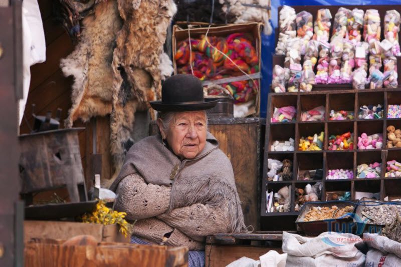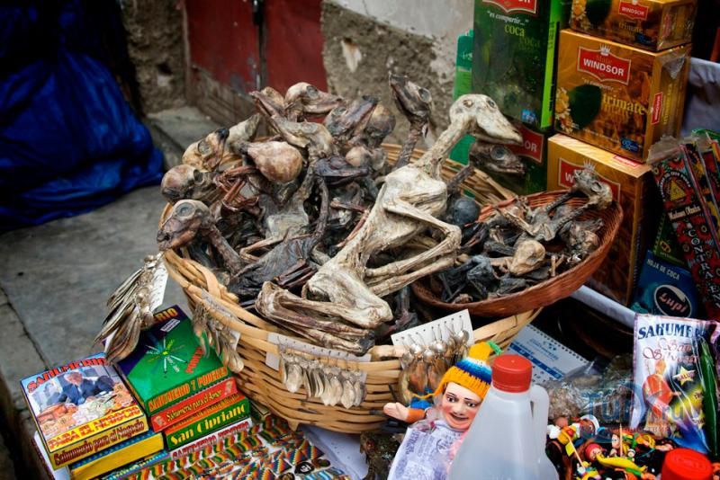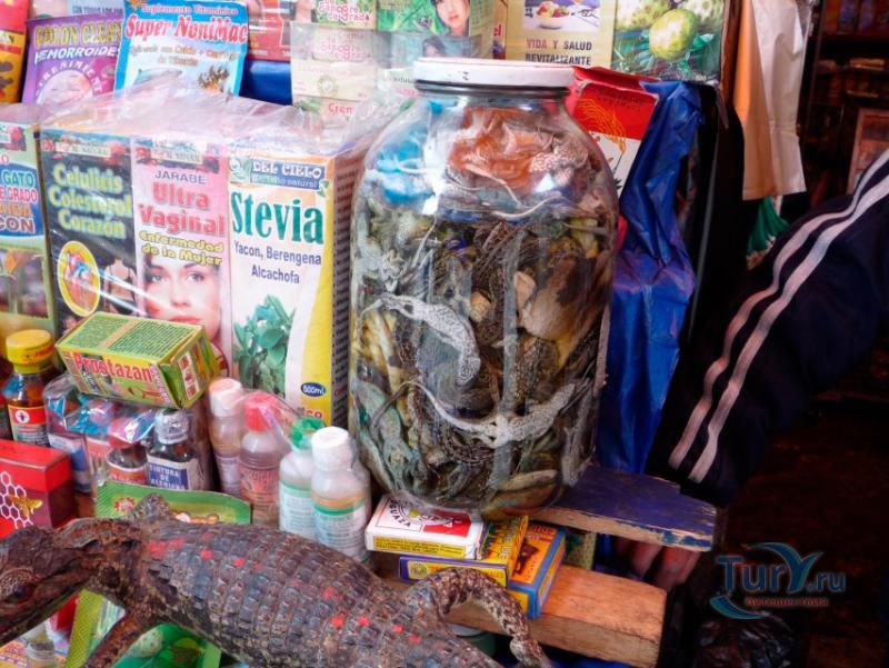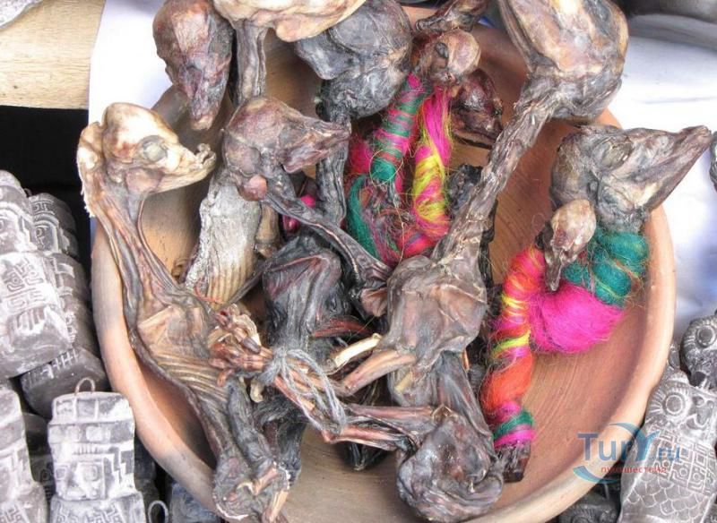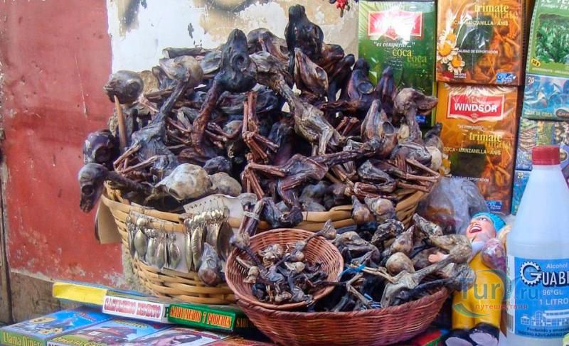 Рынок Ведьм или Меркадо-де-Брухас является одной из главных достопримечательностей Боливии, окутанный тайнами, легендами и небылицами. До Рынка лучше добираться пешком, гуляя древними и запутанными улочками города Ла-Пас. Именно пешие прогулки дадут возможность в полной мере впитать в себя окружающую атмосферу. Ведьмин рынок в Ла-Пасе единственный в мире «торговый центр», который специализируется на продаже товаров для ведьм, колдунов, знахарей и шаманов. Безусловно, вид рынка, его специфического товара и продавцов – весьма странный, но в этом вся его прелесть. На этом рынке можно набрать «потребительскую корзину» на все случаи жизни. Огромный выбор амулетов, которые приносят счастье и удачу. Для различных колдовских манипуляций продаются сушеные травы, части лягушек и насекомых, семена и, другие увлекательные ингредиенты, используемые в ритуалах и обрядах. Тем, кто пришел на Меркадо-де-Брухас не за магией, предлагается большое количество различных украшений из серебра, вязаные изделия из шерсти ламы и альпаки (это миниатюрный вид ламы), статуэтки из дерева или глины и много других интересных вещей. Самый ошеломляющий товар на ведьмином рынке – высушенные зародыши ламы или альпаки. Без них не обходится ни один ритуал: все желания-амулеты собирают в одном месте. Сверху непременно кладут зародыша ламы или альпаки, которого даже можно принарядить, чтобы задобрить. Провести ритуал можно где угодно – в домах, в частных магазинах, в офисе фирмы. То есть это что-то вроде православного освящения. Считается, что через некоторое время обязательно сбудутся все мечты: появится настоящий трактор или пекарня, муж или жена, ребенок и вообще счастье в личной жизни. Говорят, что тот, кто закопает эмбриона ламы в углу своего нового жилища, навсегда убережет себя от разных напастей. Даже если зародыши ламы не понадобятся для колдовства или целительства, то увидеть их – само по себе уникальное зрелище. На рынке Ведьм туристам не советуют фотографироваться и делать снимки товара. Боливийцы искренне верят, что фотографируя, вы забираете частичку их души, ослабляете их здоровье.