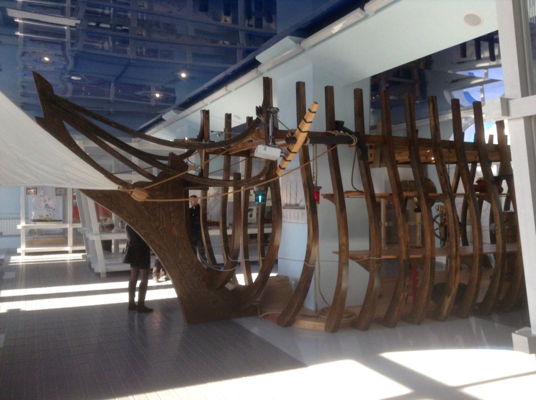 Экспозиционное пространство стилизовано под "парусный корабль в Арктике", декоративные конструкции напоминают детали такелажа, элементы устройства судна
