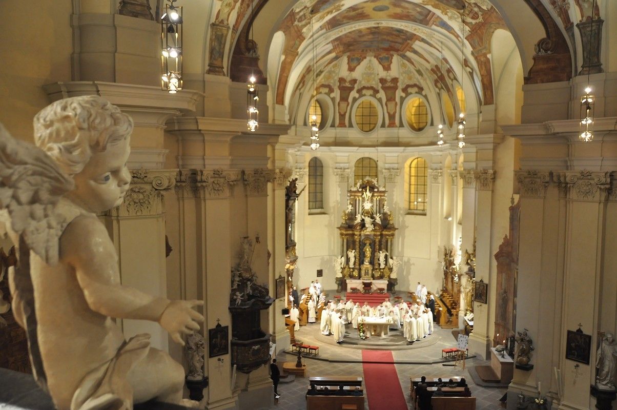 В здании конвента находится зимняя трапезная, ризница, капитульный зал с потолочной фреской Христа, омывающего ноги апостолам, написанной в 1745 году, летняя трапезная с потолочной фреской Чудесное умножение хлебов, датированной 1739 годом, и бильярдный зал. На этаже выше расположена монастырская библиотека с расписным потолком. Шкафы в библиотеке сделаны в стиле барокко и рококо, богато украшенные резьбой.