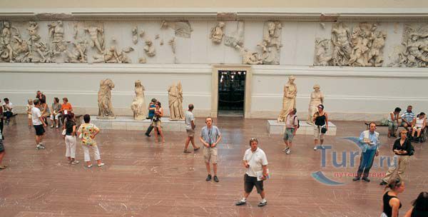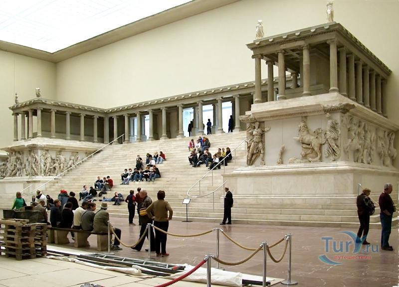 Музей был спроектирован архитекторами Альфредом Месселем и Людвигом Хофманом и построен в 1910 - 1930 гг. В нем хранятся реконструированные монументальные сооружения в натуральную величину, такие как Алтарь Пергамон, Рыночные ворота из Милетуса, Ворота Иштар, состоящие из частей, привезенных с мест археологических раскопок. Музей подразделен на античную коллекцию, музей Среднего Востока и Музей исламского искусства. Ежегодно его посещают около 850 000 человек. Музей Среднего Востока, расположенный в южном крыле, содержит одну из крупнейших коллекций предметов искусства из древнего Вавилона, Персии и Ассирии. Среди экспонатов представлены процессионная дорога с воротами Иштар из Вавилона, датируемая 580 годом до н.э, тронный зал Навуходоносора, а также клинообразные глиняные кусочки, подтверждающие существование цивилизаций, создававших керамику, стекло и металлические объекты в то время, когда Европа ещё была переполнена примитивными племенами. Верхний уровень музея Пергамон принадлежит музею исламского искусства, где размещены экспонаты, созданные в 8-19 веках н.э. Особый интерес вызывают миниатюры, ковры, резьба по дереву, а также фасад незаконченного исламского дворца Мшатта, подаренного Оттоманским султаном Абдулом Хамидом II императору Германии Вильгельму II.