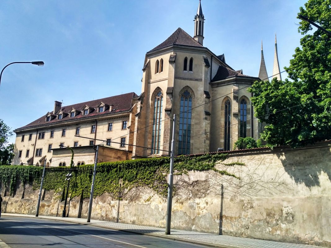Строительство обошлось в ту же сумму, что и строительство Каменного (Карлова) моста (Karlův most). Архитектор неизвестен. Храм в честь Св. Иеронима (sv. Jeroným), Кирилла и Мефодия (Cyril a Metoděj), Войтеха (Адальберта) и Прокопа (Vojtěch a Prokopa), а позднее Девы Марии (Panna Marie) носит некоторые архитектурные элементы и фигурные темы, напоминающие произведения придворной строительной организации под руководством Петра Парлера (Petr Parléř). Его стиль также напоминает и отважное решение построить необычное массивное зальное здание без башни, позднее изображаемое на старых гравюрах Праги. Строительство длилось 24 года, включая восхитительное художественное оформление. В левом углу за алтарем находится скульптура сидящей Монсерратской Богоматери – Черная Мадонна, при бомбардировке костела в 1945 г. скульптура чудом не была повреждена и была отвезена в костел св. Игнатия (sv. Ignác) на Карловой площади (Karlovo náměstí), откуда после реконструкции была возвращена на прежнее место. Настенные росписи считаются редчайшими памятниками чешской готики. Коридор с крестовым сводом – галерея – украшен парными росписями, т.е. изображающими сцены из обоих библейских Заветов. Этот вид фресок считается европейским раритетом и бесценным памятником, сохранившимся с готической эпохи. В 50-е гг. Фрески были отреставрированы специальным методом, заключающимся в создании острым инструментом сети царапин для лучшего сцепления новых слоев штукатурки с основой. Монастырь практически без ущерба пережил все исторические потрясения. Во время гуситских восстаний он перешел каликстинцам, здесь размещался гуситский гарнизон, поэтому он избежал народного гнева и уничтожения. В XVI в. аббат Матоуш Бенешовский (Matouš Benešovský) сделал из него трактир с кегельбаном и музыкантами для развлечений, в начале XVII в. здесь пару лет жил астроном Кеплер.