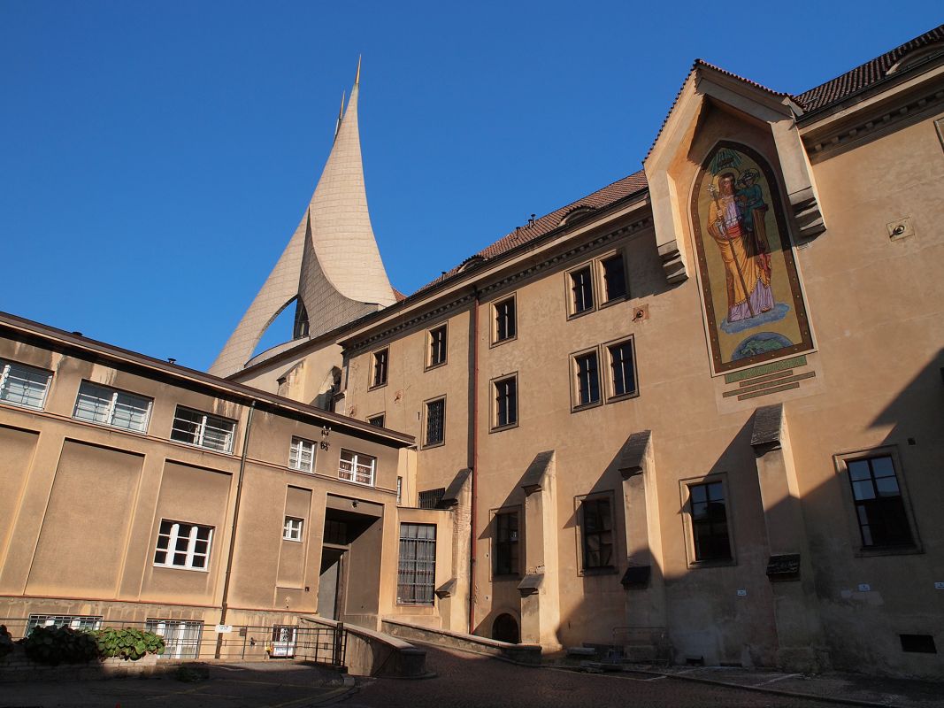 Необычные белые современные башни с позолоченными шпилями украсили в 60-х годах бенедиктинский костёл на Слованах, оригинальные купола которого сгорли при бомбардировке Праги в 1945 году. Монастырь был основан Карлом IV в 1347 г. и стал центром духовного образования, искусства и славянской письменности. В галереях клуатра сохранились ценные настенные фреск; храм Девы Марии исполнен в бероунском художественном стиле.