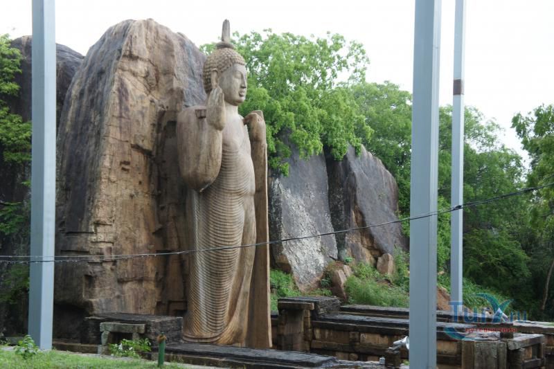 Среди многочисленных статуй Будды, найденных на Шри-Ланке, Аукана Будда - одна из лучших скульптур в Южной Азии. 13 метровая статуя, высеченная из целого камня, датируется V веком нашей эры и приписывается королю Датусене (459-477 гг). Несмотря на колоссальные размеры, пропорции статуи до того совершенны, что капли дождя, падающие с носа, приземляются с точностью до миллиметра посередине между ступнями ног. В данном случае тип лица Будды довольно необычен для Шри Ланки. Выразительно очерченные припухшие губы, прямой и довольно широкий нос, с контурной линией сливающейся с покатостью лба, линии надбровных дуг круто изгибаются над глазницами с тяжелыми закрытыми веками. Лицо лишено эмоций и напоминает застывшую маску. Левая рука Будды прижата к плечу, правая поднята, но выше обычного и при этом повернута не ладонью, а наполовину ребром к зрителю, что больше напоминает современное приветствие. Со временем статуя Будды в Аукане стала своеобразной моделью для более поздних мастеров, занимающихся созданием скульптур стоящего Будды.