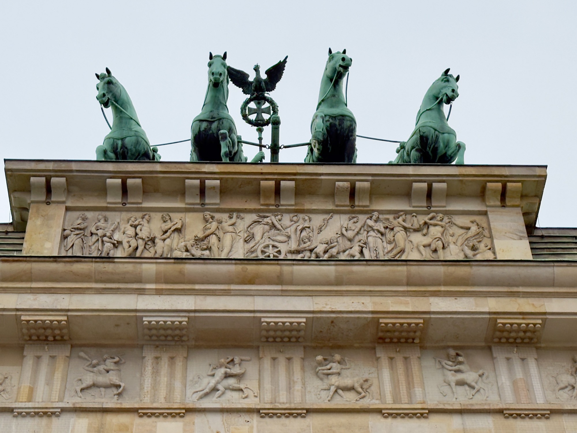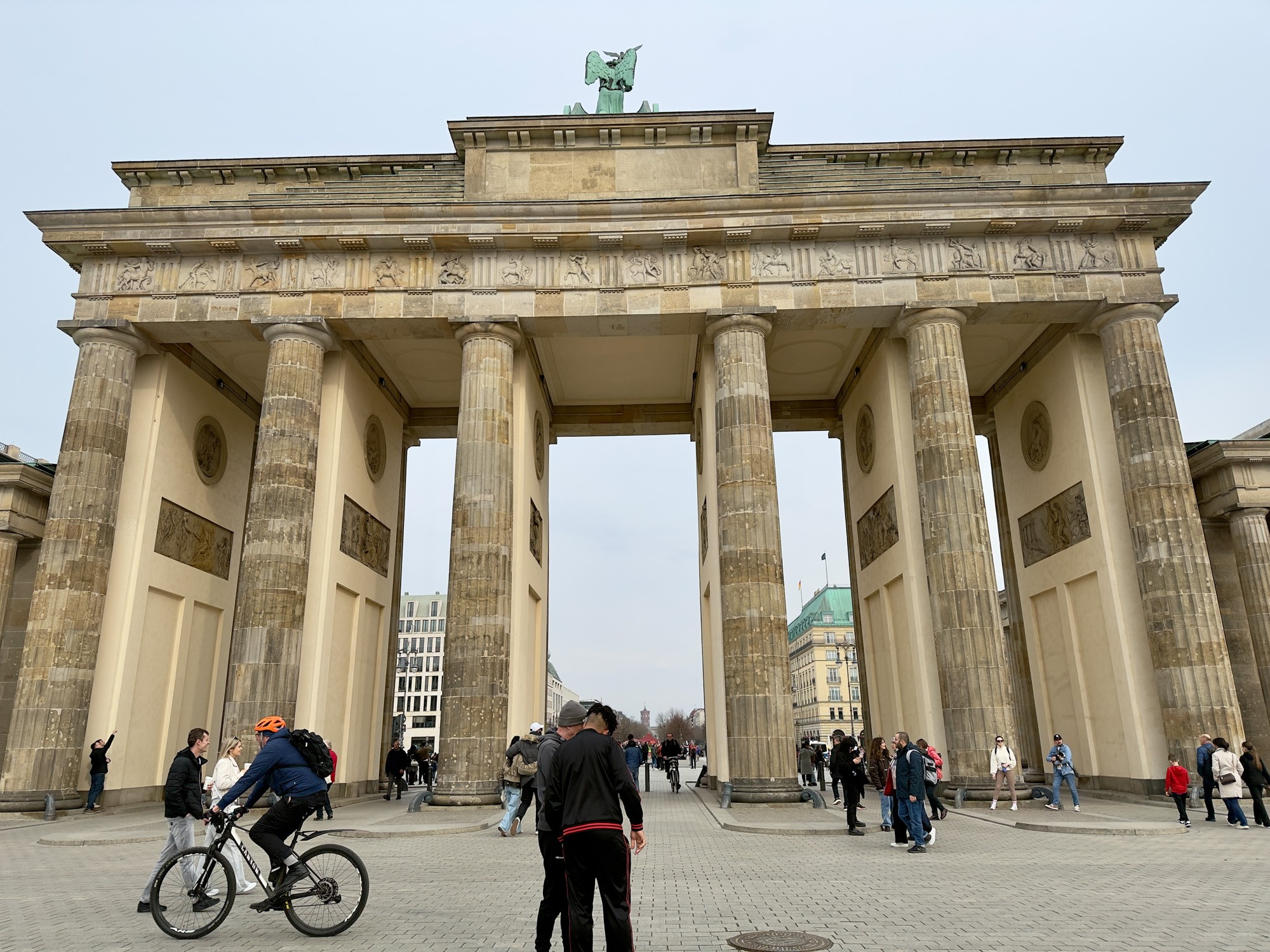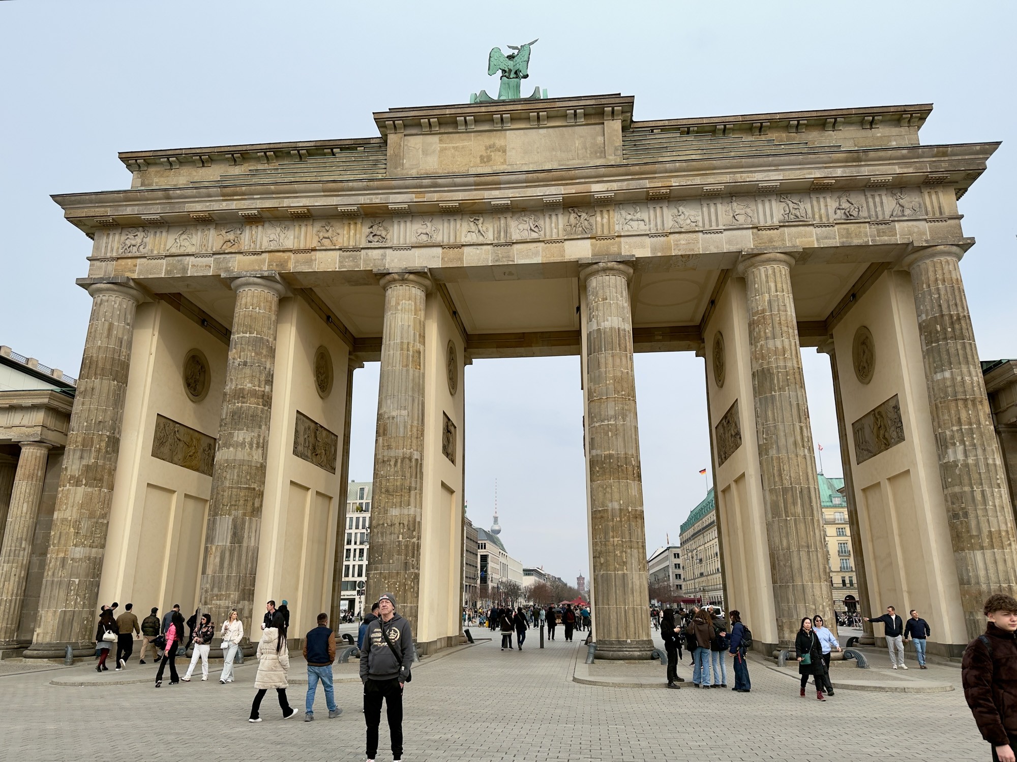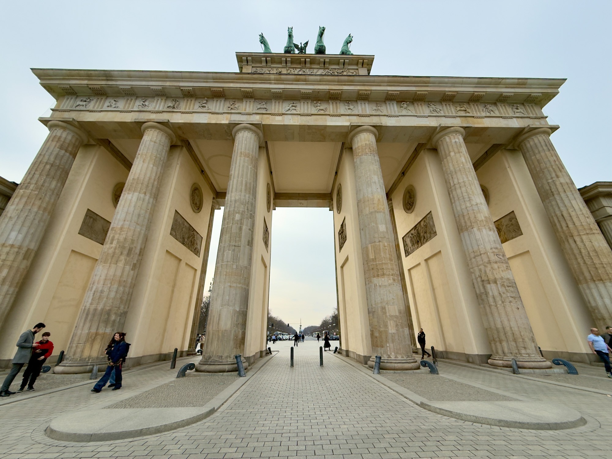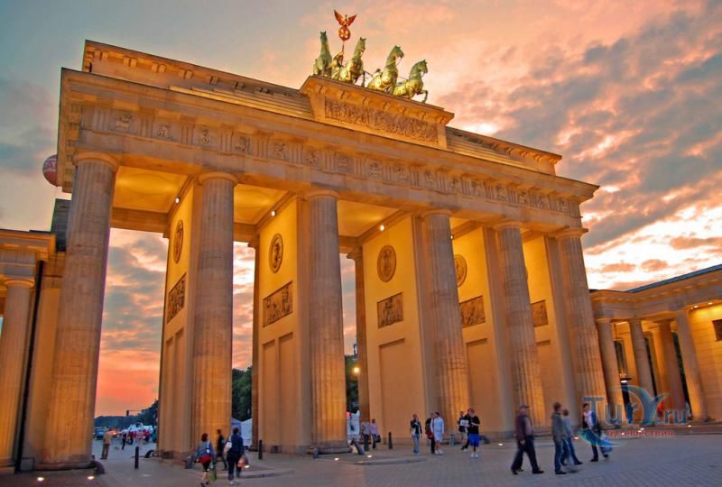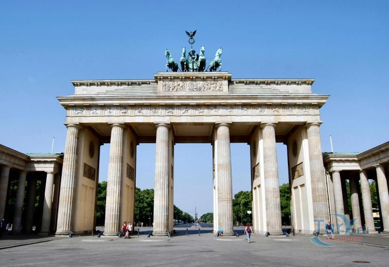 Это триумфальная арка, расположенная в самом центре Берлина, один из символов города. Ворота возвышаются на Парижской площади и являются напоминанием о том времени, когда в Берлин можно было въехать через них. Ворота были заказаны Фридрихом Вильгельмом II в знак мира и спроектированы Карлом Готтхардом Лангхансом в 1788 – 1791 гг. Высота Бранденбургских ворот 26 метров, длина – 65.5 метров и толщина 11 метров. Бранденбургские ворота состоят из 12 греческих дорических колонн, по шесть с каждой стороны. На их создание авторов вдохновили древнегреческие Пропилеи - монументальный вход в Парфенон в Афинах. Над воротами возвышается знаменитая и часто фотографируемая Квадрига работы Готфрида Шадова, построенная в 1793 году, на которой изображена статуя богини Мира, правящая колесницей, запряженной четырьмя конями.